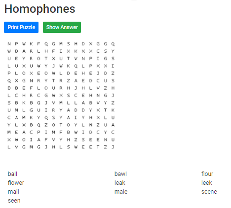 scene, seen, mail, male, bawl, ball, leek, leak, flour, flower