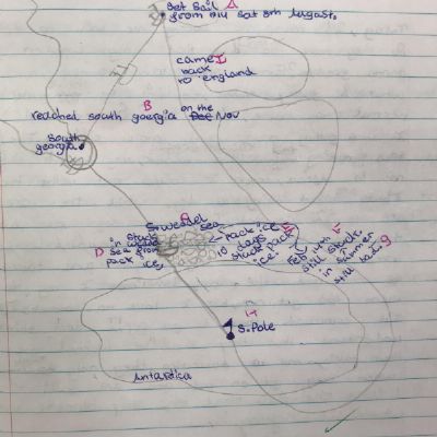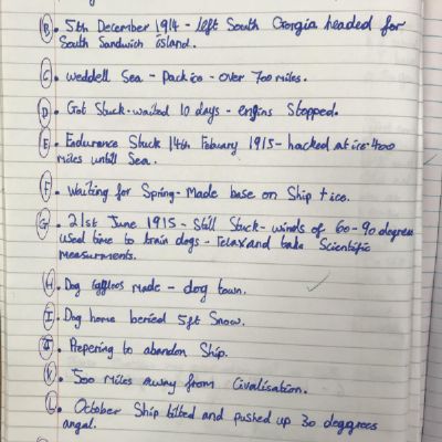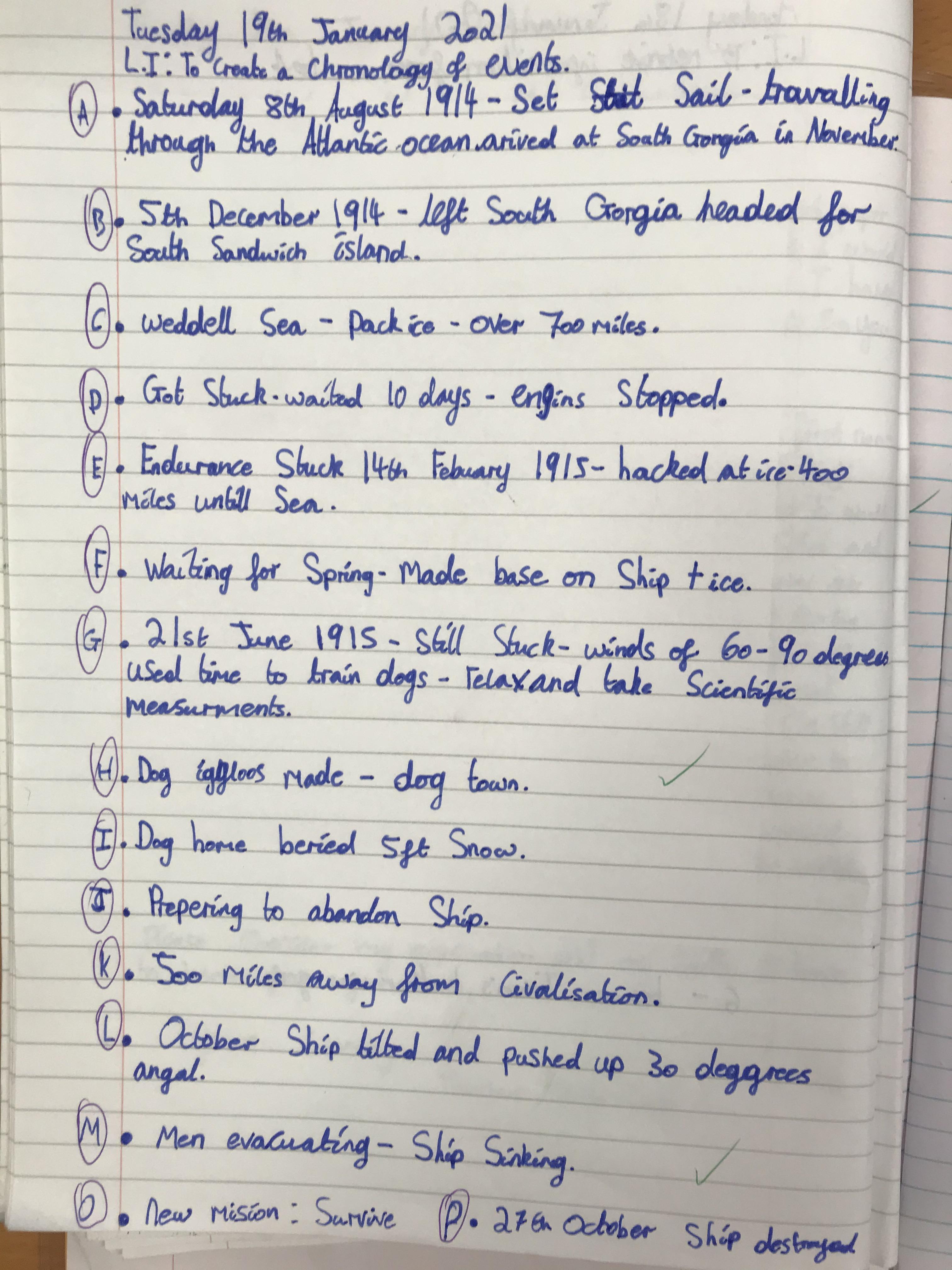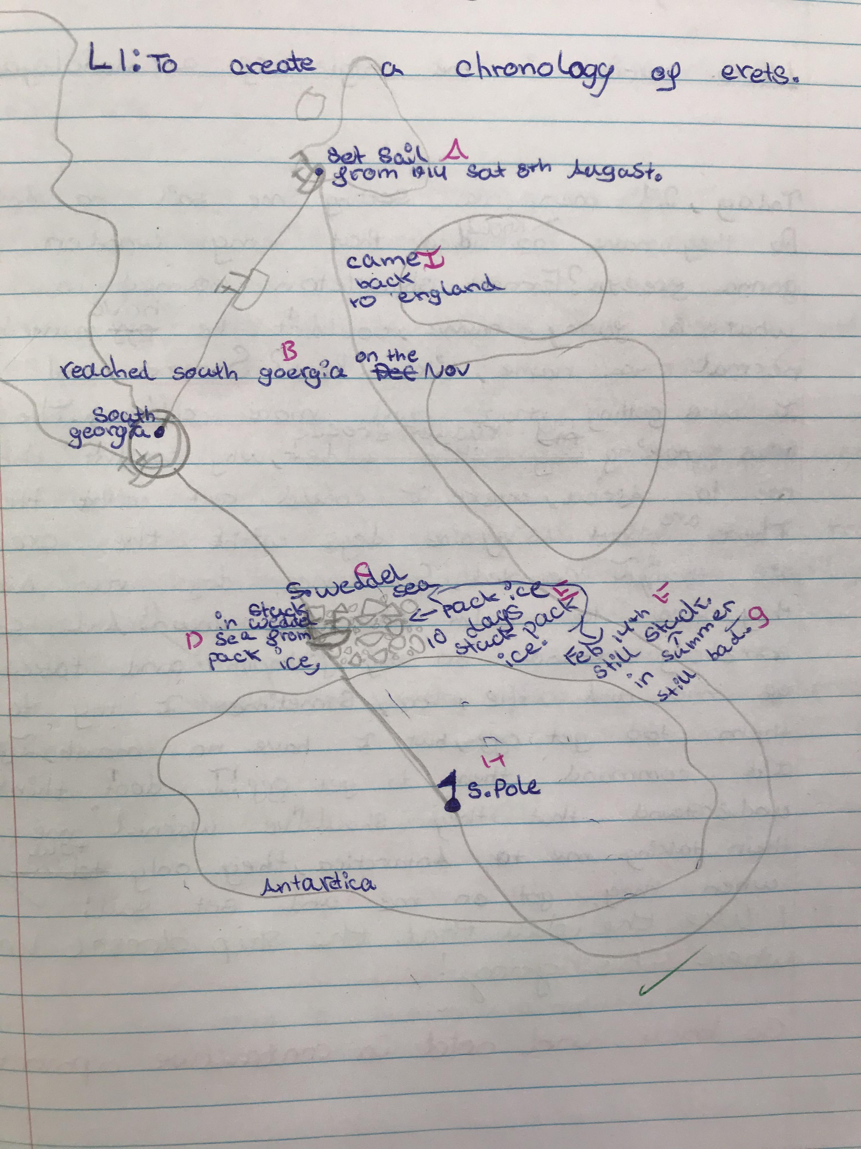 Go to the UKS2 hub team, files, open the folder that says Shackleton and the video file is here (Shackleton's Journey End). You will need to complete your story timeline that you created back in week 1, where we mapped out the adventure so far (see examples from the school bubbles below) and extend the story to its conclusion (from being stranded in Antarctica to being rescued!)