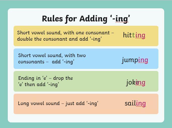 Here is a reminder of the rules for adding -ing to root words to help you with your writing today.