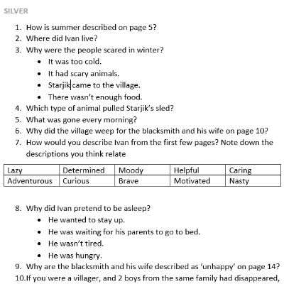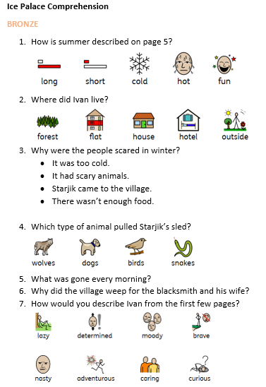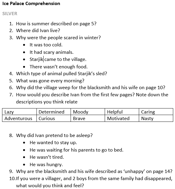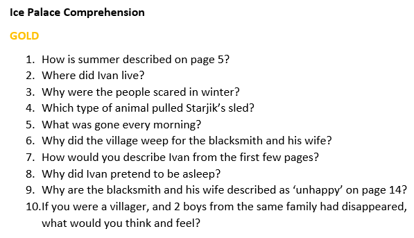 Today we are going to put the practice into action and answer questions about Ice Palace. The answers are on pages 5 - 15 and those pages are below. You will find 3 levels of questions underneath: bronze, silver and gold. Pick the set of questions you would like to answer (make it a challenge) and the check your answers using the answer sheet.