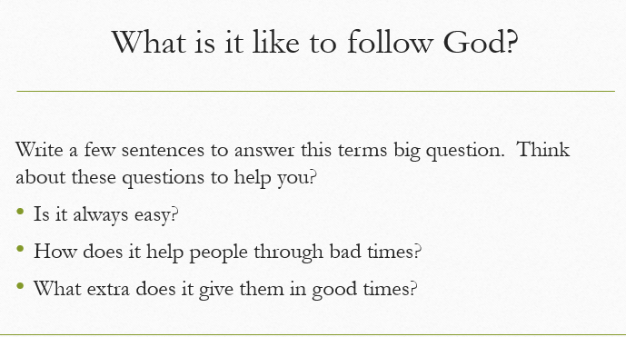 Trust or faith is what believers of all religions think is important when following God. Today we're going to look at who we trust and why and also think about Abraham's story again and how he was able to follow God. Lastly, we're going to write about what we think ourselves about what it is like to follow God. You could write sentences or record these ideas as a poster to show what you have learned from Abraham's story and your own ideas!