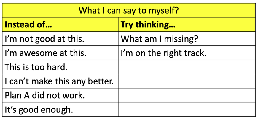 Look at the table below and think about self-talk responses (self talk is the way that we talk to ourselves).