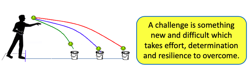 Today we are going to think about how we feel and react when faced with a challenge. To begin with, take 3 plastic bowls, buckets or cups and place them on the ground, one in front of the other. The first should be about 1 metre from you, then next a little further away and the third one, further still. Now take 3 pieces of scrap paper and make 3 paper balls, or if you have them, use 3 small balls (a tennis ball would be ideal).