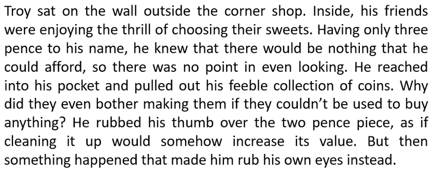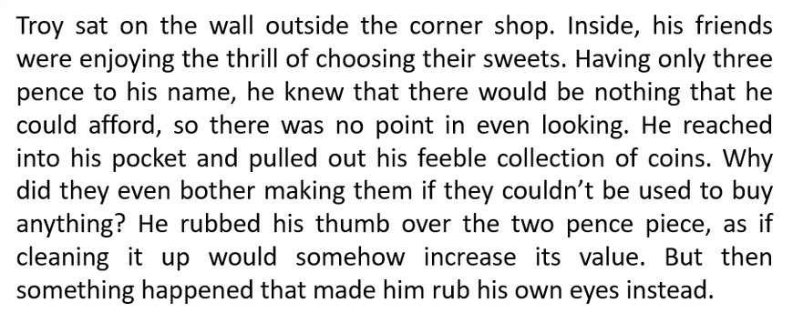 Think about why the writer has used those words and write about why they make for a good opening to a book. How does it make the reader feel with the detailed description and exciting vocabulary? What other devices has the writer used to make you want to carry on with the book?
