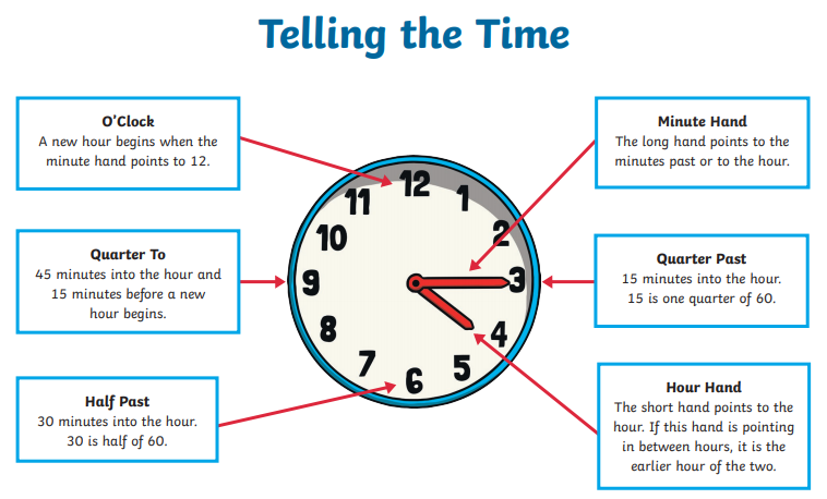 Maths - Today we are looking at quarter past the hour and quarter to the hour. For quarter past the hour the minute hand (the long hand) in on number 15. For quarter to the hour the minute hand is on the 9. Watch this video clip to help.