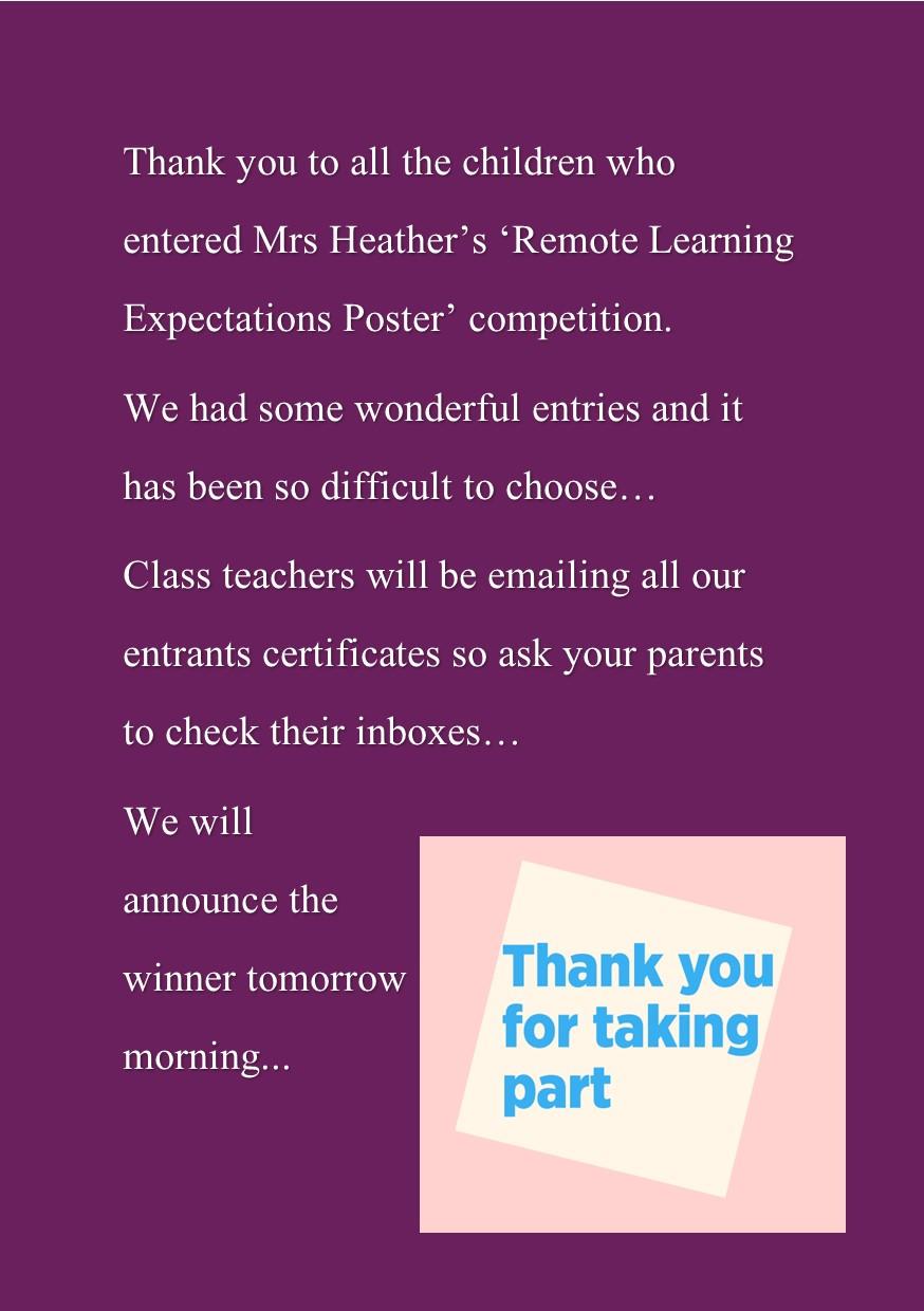 Good morning! Well done to all the children who have already finished their English assignment. You are all fantastic and we are so proud of how hard you are working! Thank you so much for all the entries to the poster competition. A big well done to all the entrants! Today Mrs Heather will be announcing the winner.