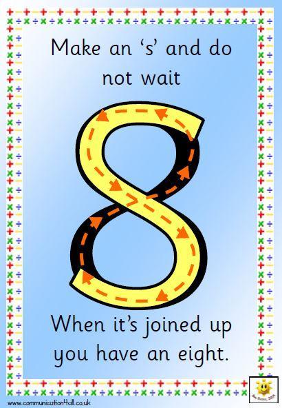 Yesterday we focused on number 7, which number is one more than 7? That’s right number 8. Today’s focus for handwriting is number 8, and the number rhyme is “make a s but do no wait when they’re joined up you have an 8”