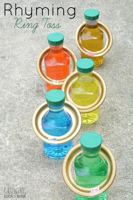 5) Rhyming ring toss: One idea for this is you could write a word or stick a picture on the bottles, when you throw the hoop onto it can you say a rhyming word. Or you could have pictures or words on the rings and you have to throw them to the correct bottle with the rhyming word on. Tip: the rings are made out of paper plates!