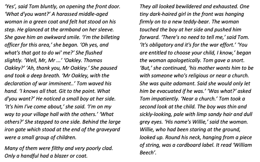 Read the extract below from 'Goodnight Mr Tom' by Michelle Magorian. You might like to listen to Miss Flisher reading the whole chapter.