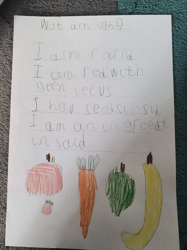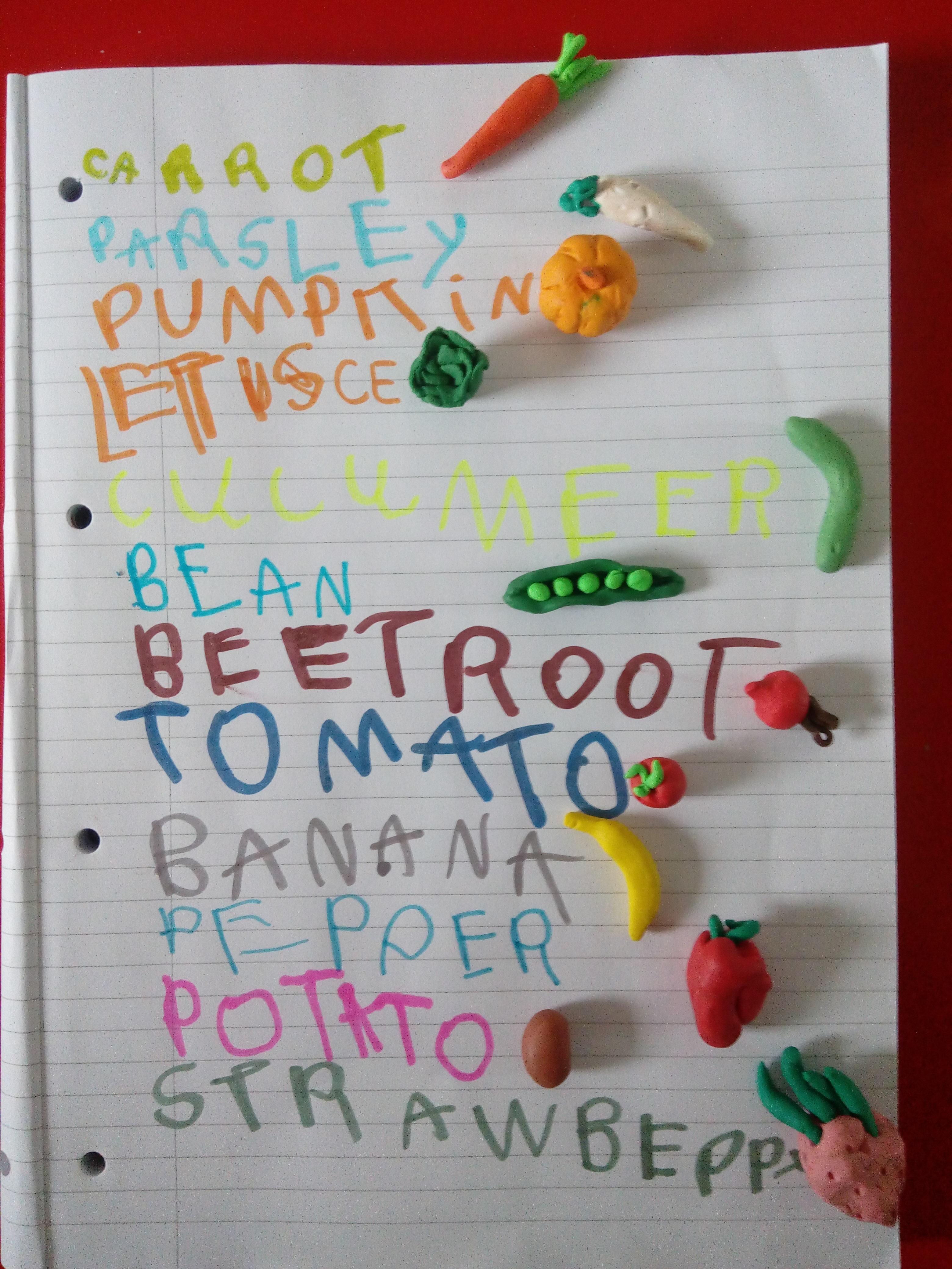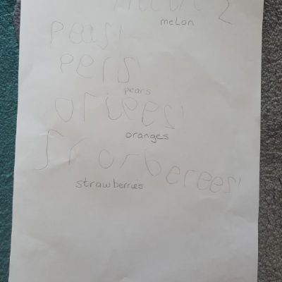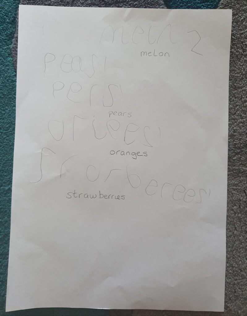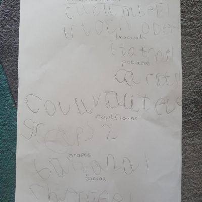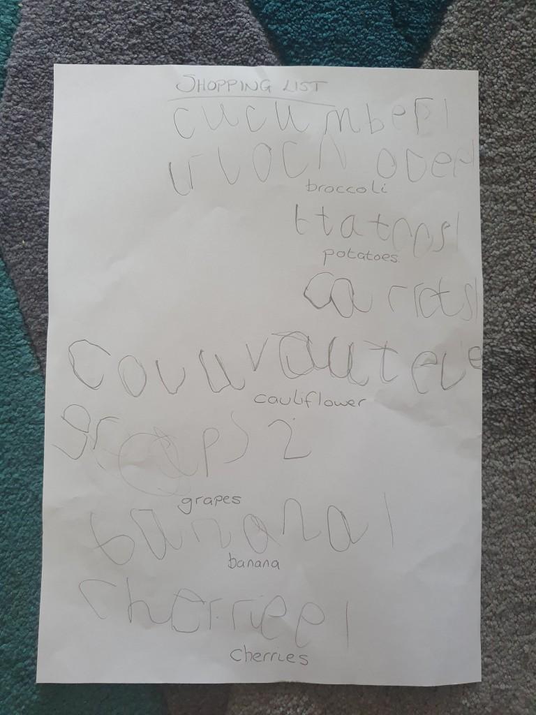 Erin has been using her phonics knowledge to help her write a shopping list with different fruits and vegetables on. Well done for remembering and using the digraphs we have been learning!!