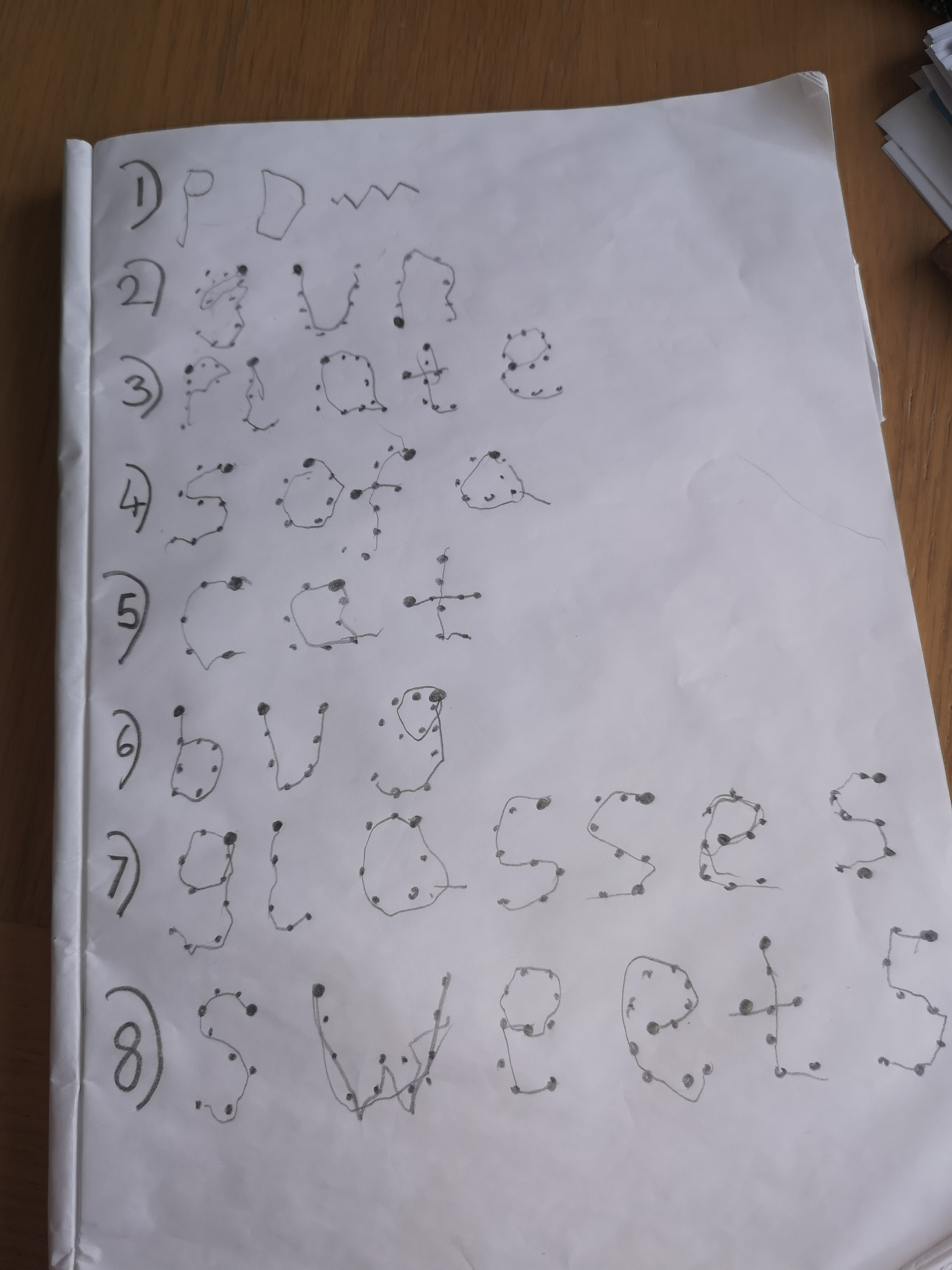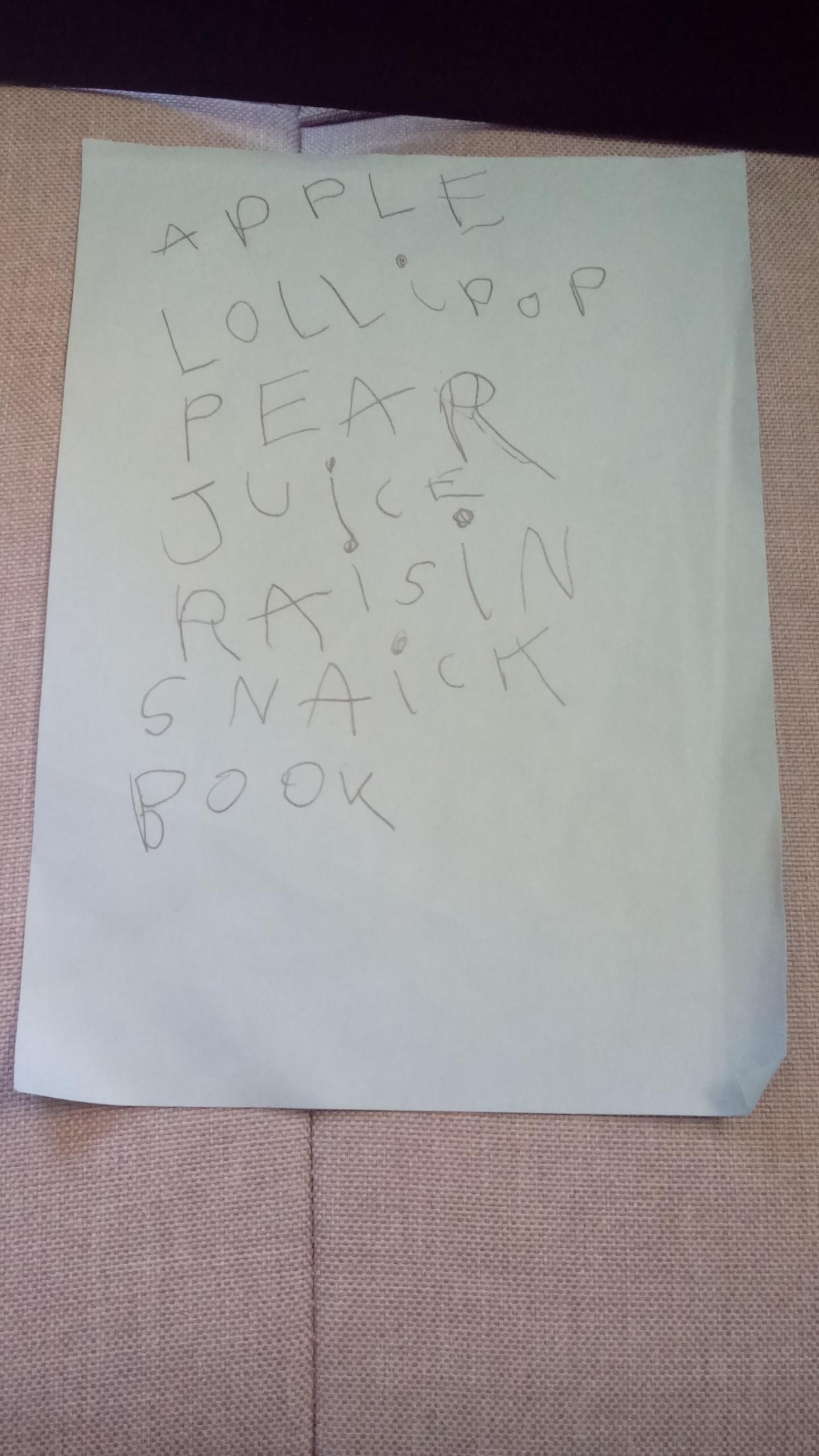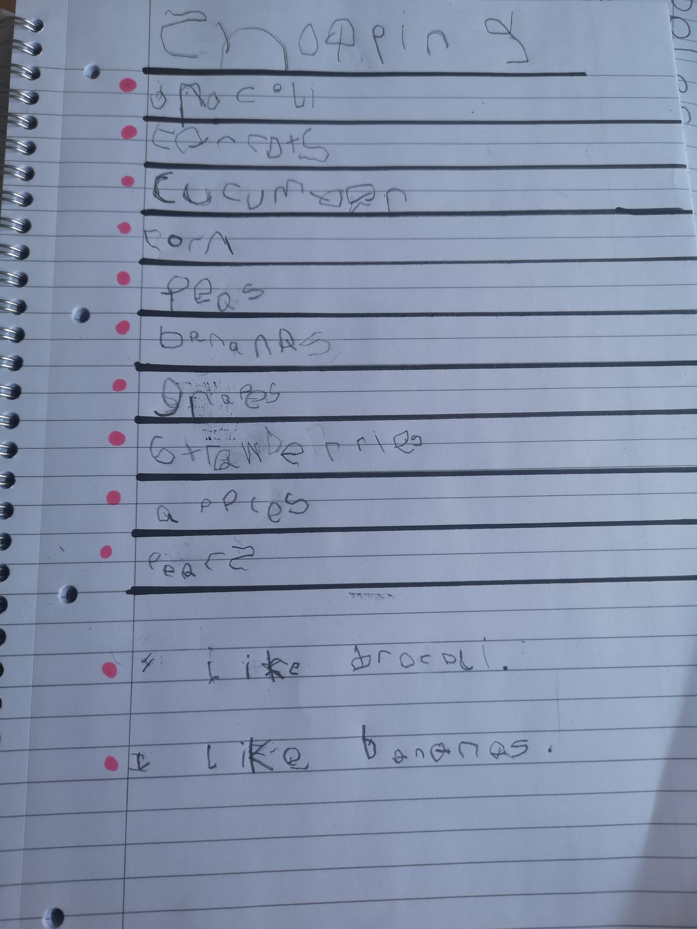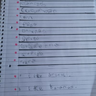 Erin has been using her phonics knowledge to help her write a shopping list with different fruits and vegetables on. Well done for remembering and using the digraphs we have been learning!!