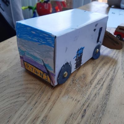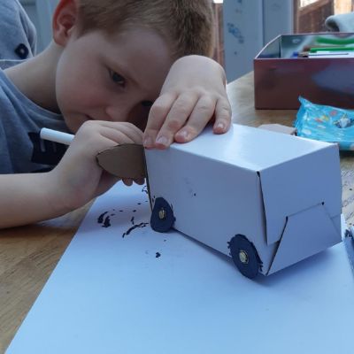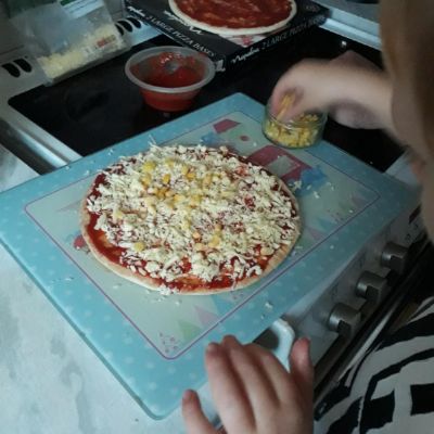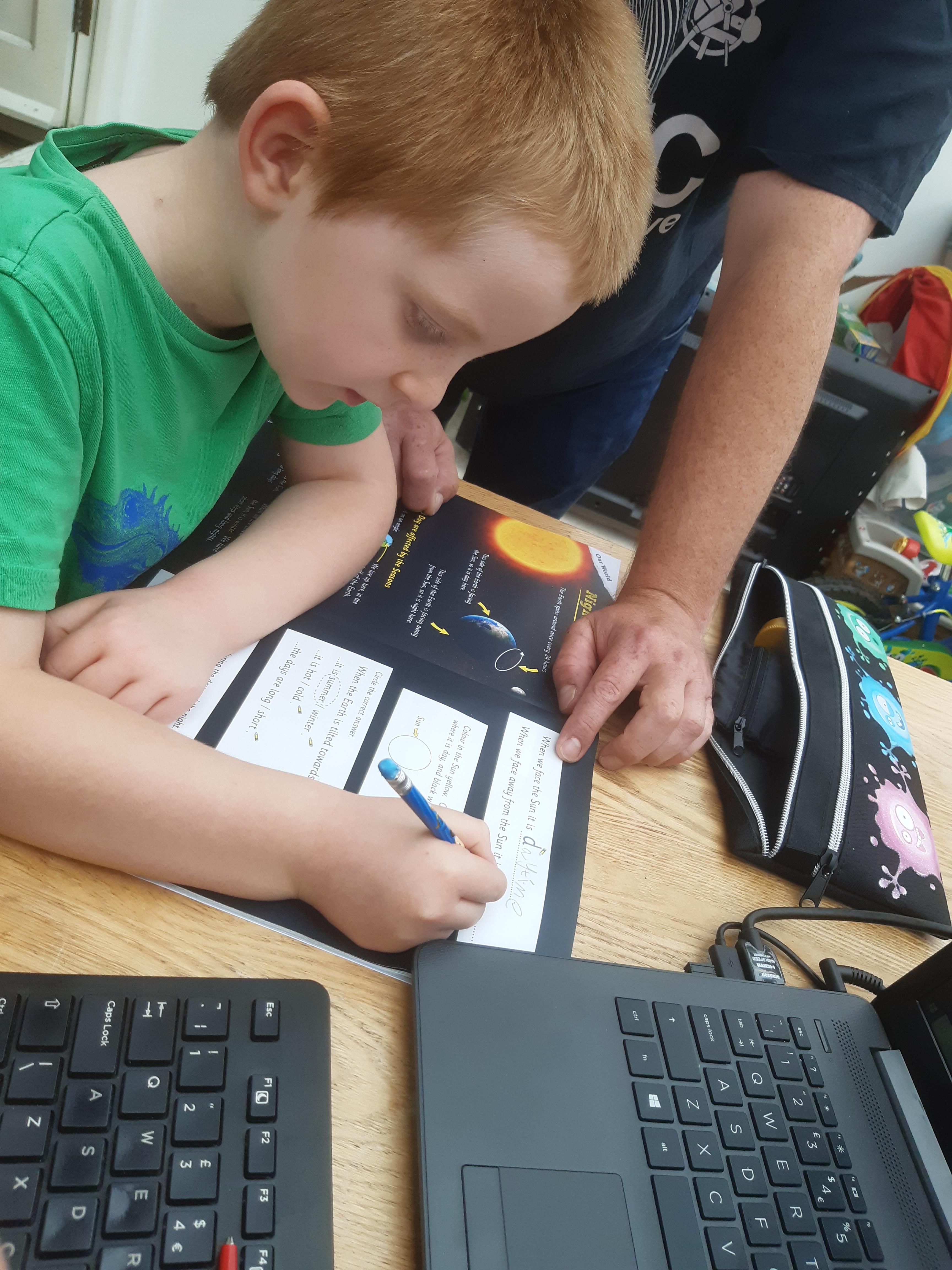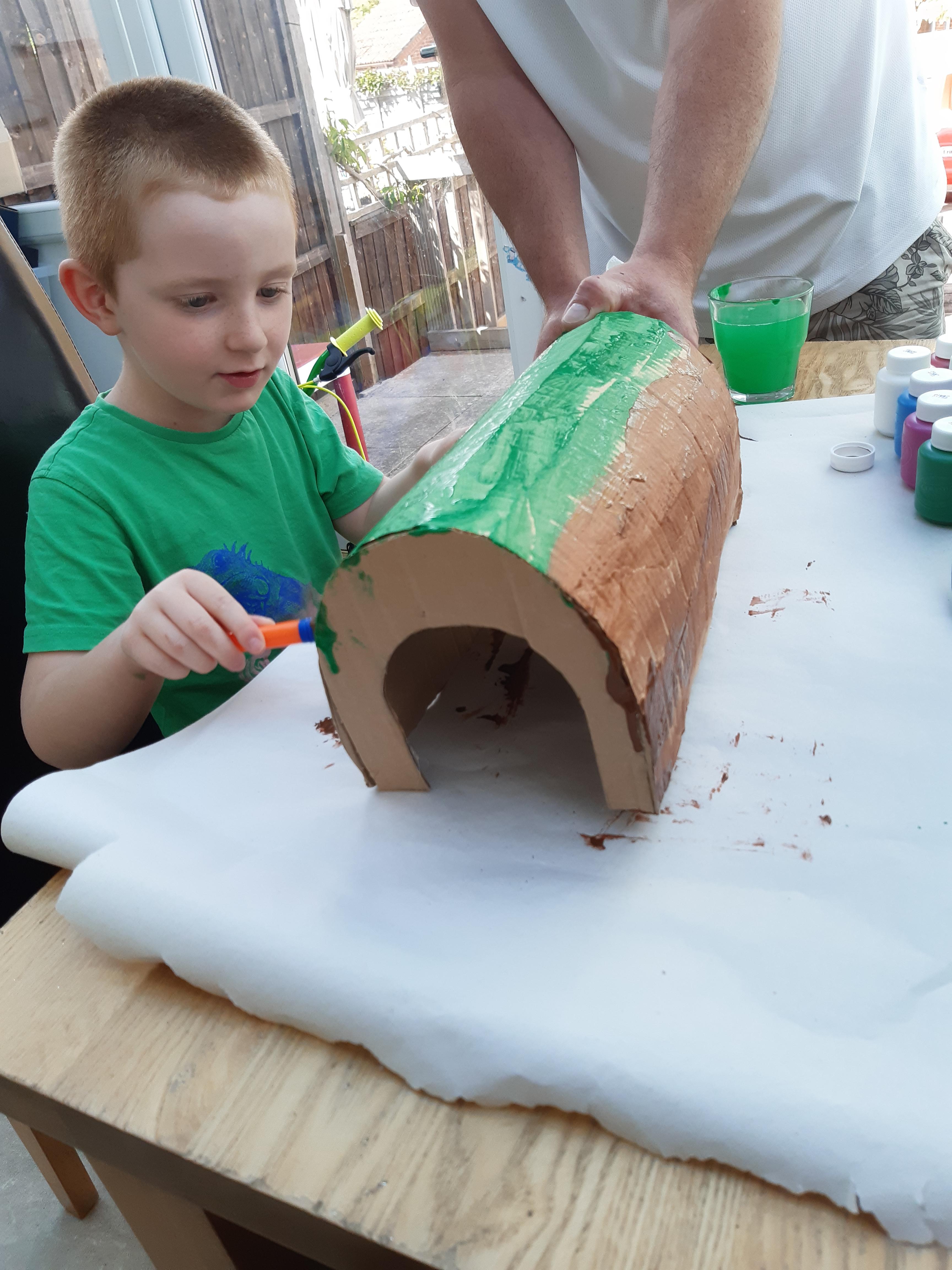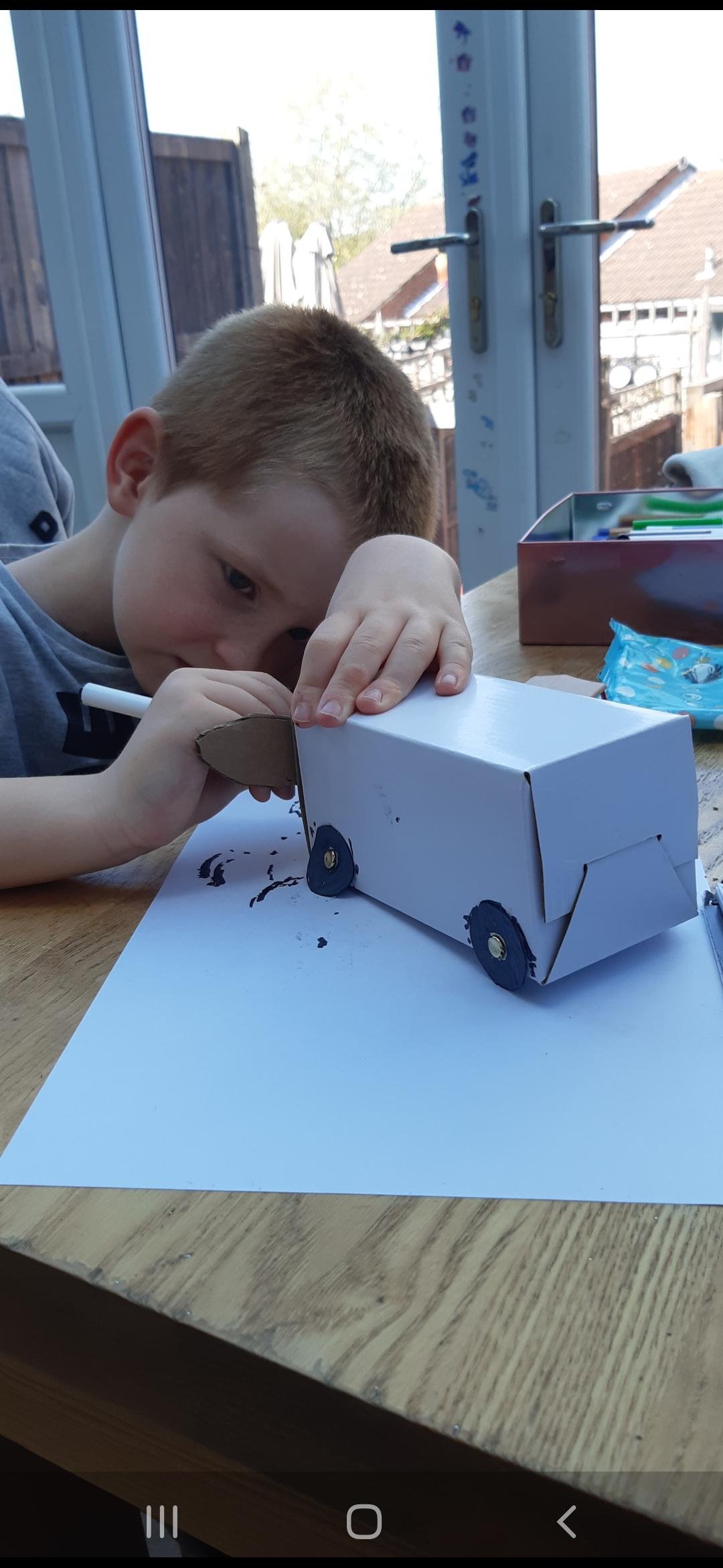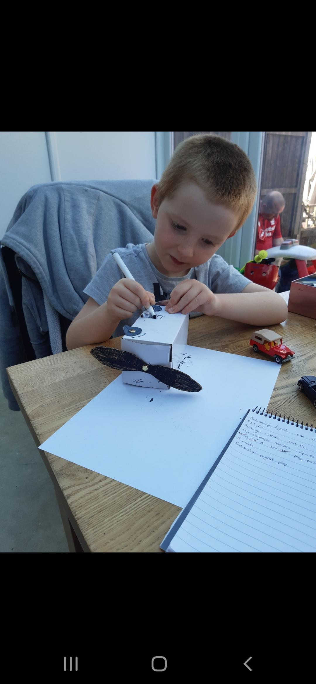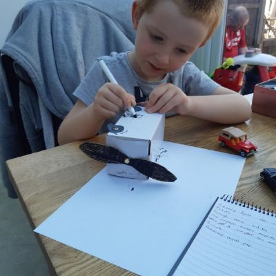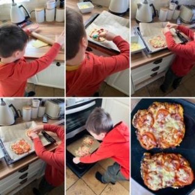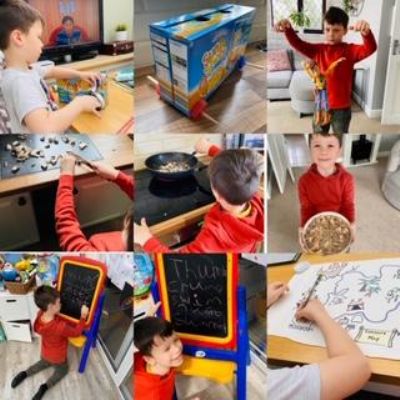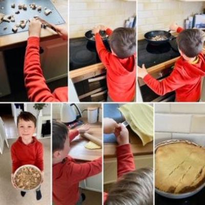 Luke has had a very busy and creative day making a moving toy, helping mum make chicken and mushroom pie, making a pizza, going for a windy walk, making dens and practising spelling and halves.