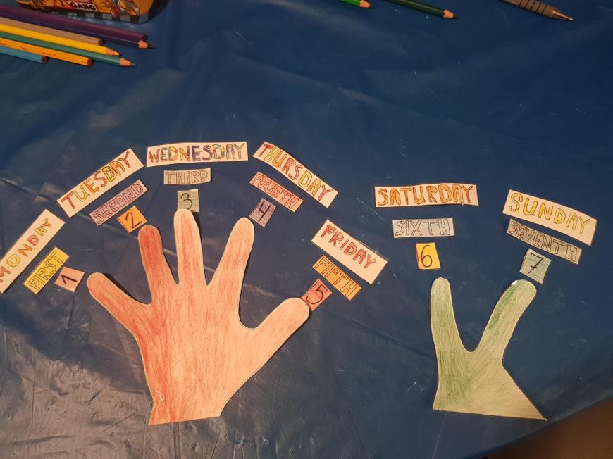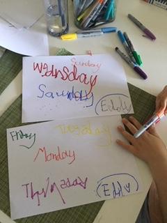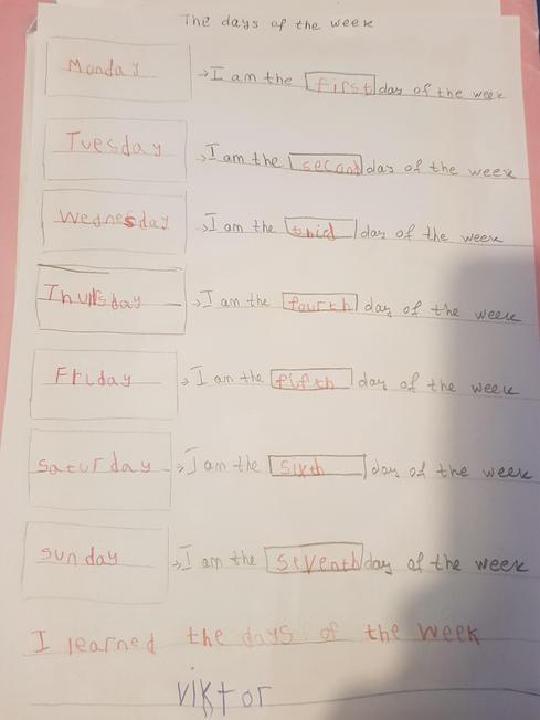 ".... great and fun ideas for keeping us motivated on spelling the days of the week. We really had a great time today ... here's  Edward’s writing with his opposite hand. He hopes to “make your day and make you laugh a lot about it!"  Well you succeeded Eddy  - I did laugh A LOT!!