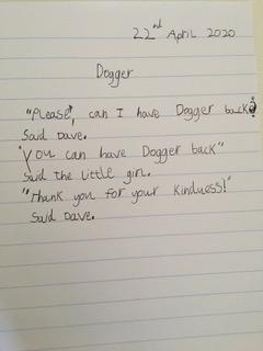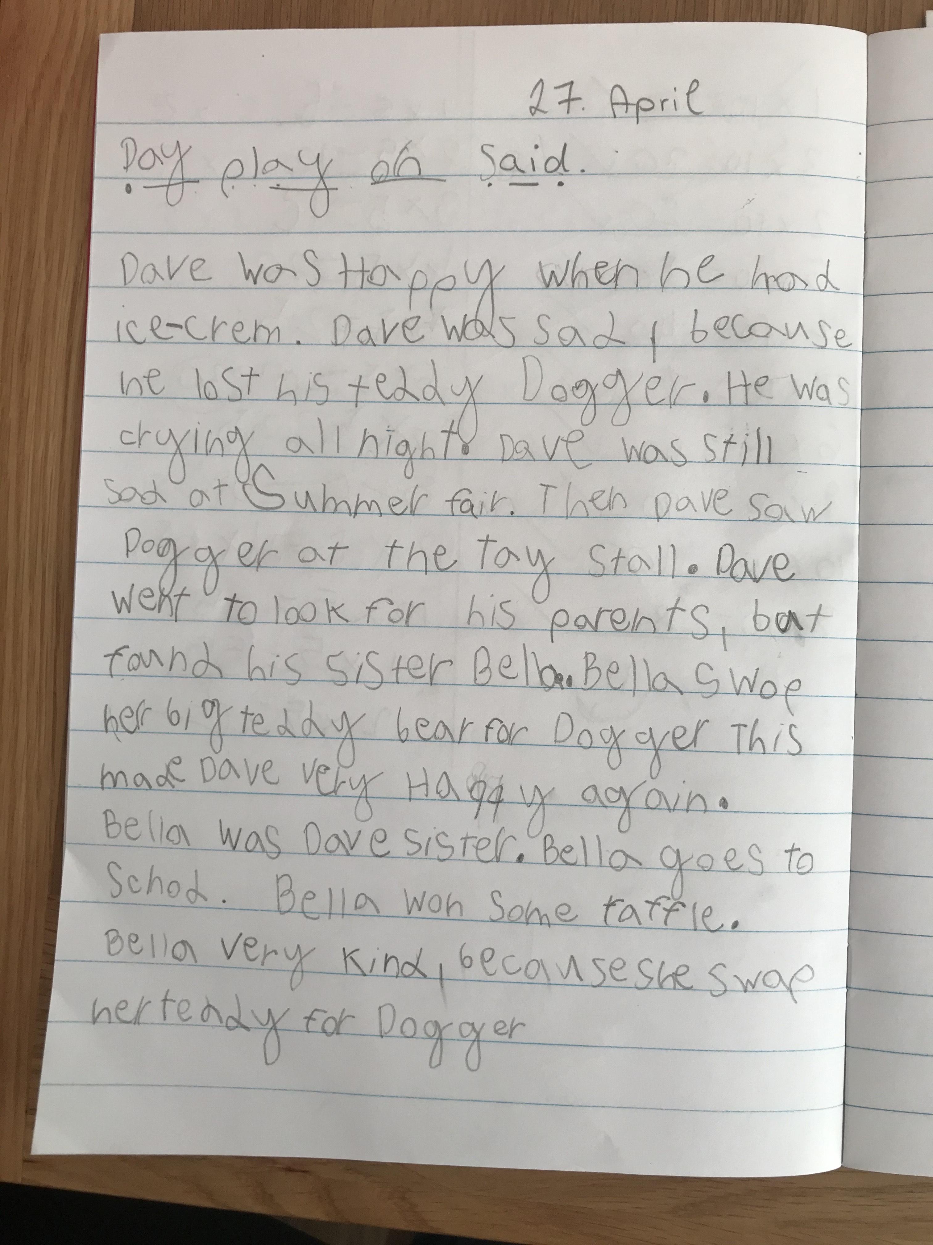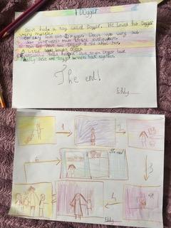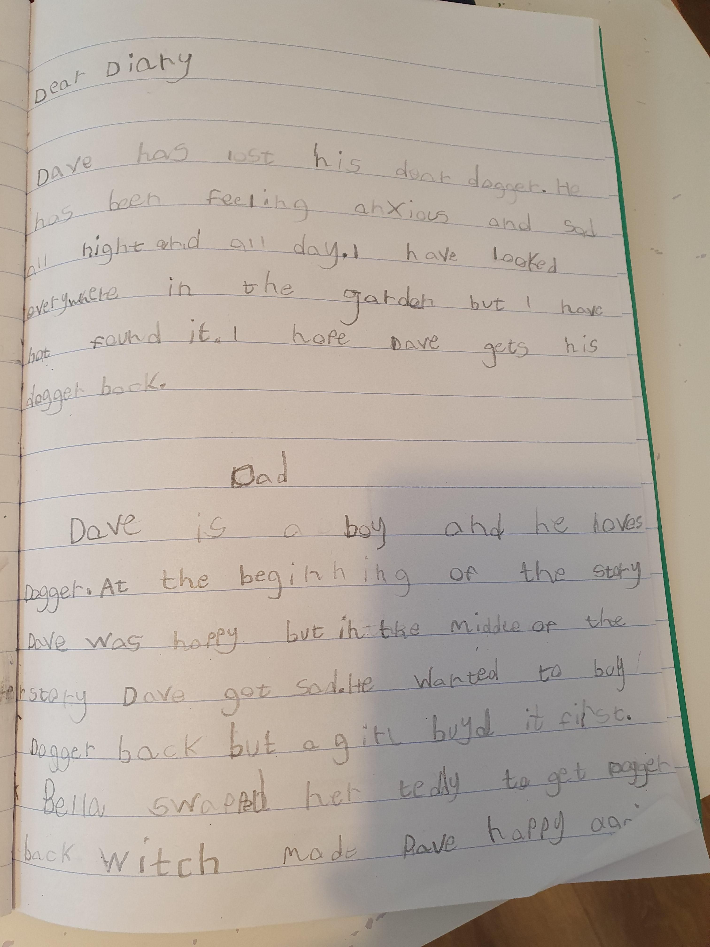 "Sophie has been working hard on her homework pages, she has listen to the Dogger story and written about Dave and Bella"