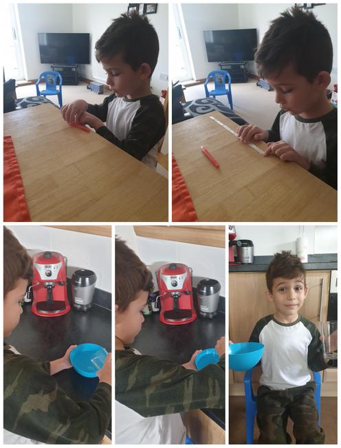 Edward has been investigating measuring at home using the kitchen tools. He explored and compare different ways to measure mass, length and volume. Super learning Eddy!