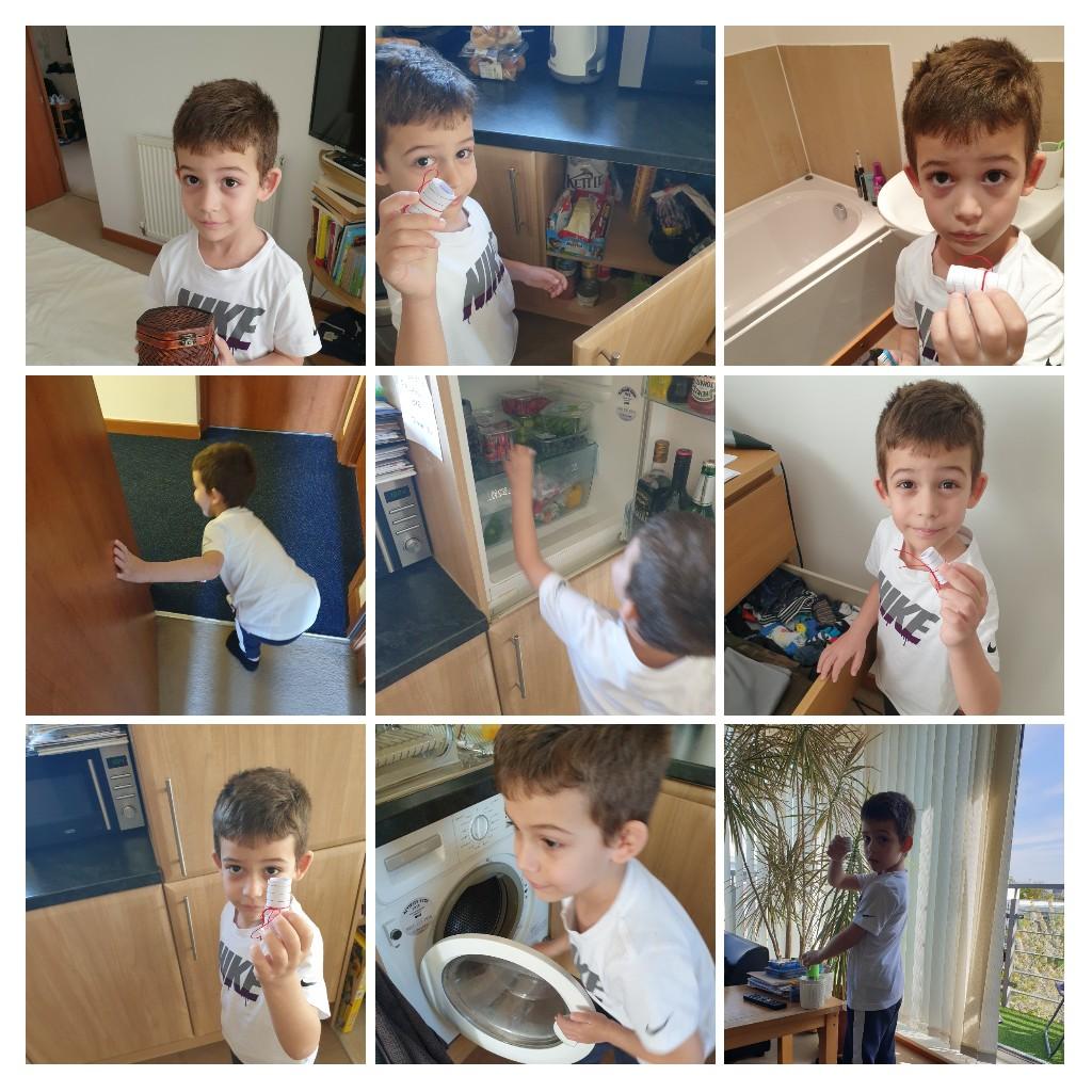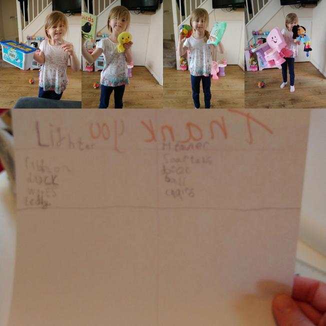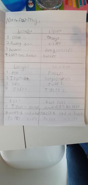 measurement to measure things around the house, using mathematical language to compare which is longer/shorter, heavier/ lighter or full/empty. Jude created a table to classify and record his findings.
