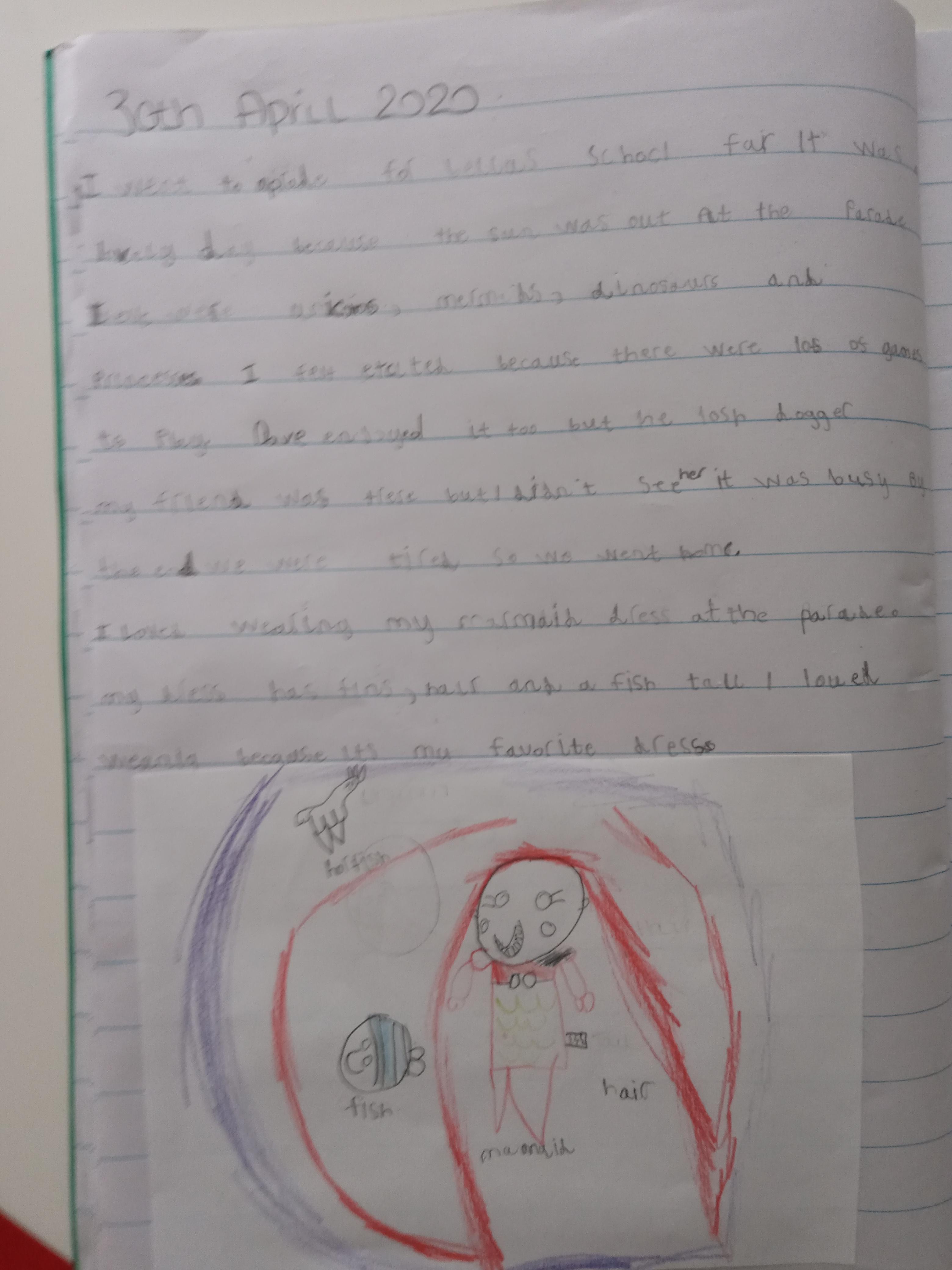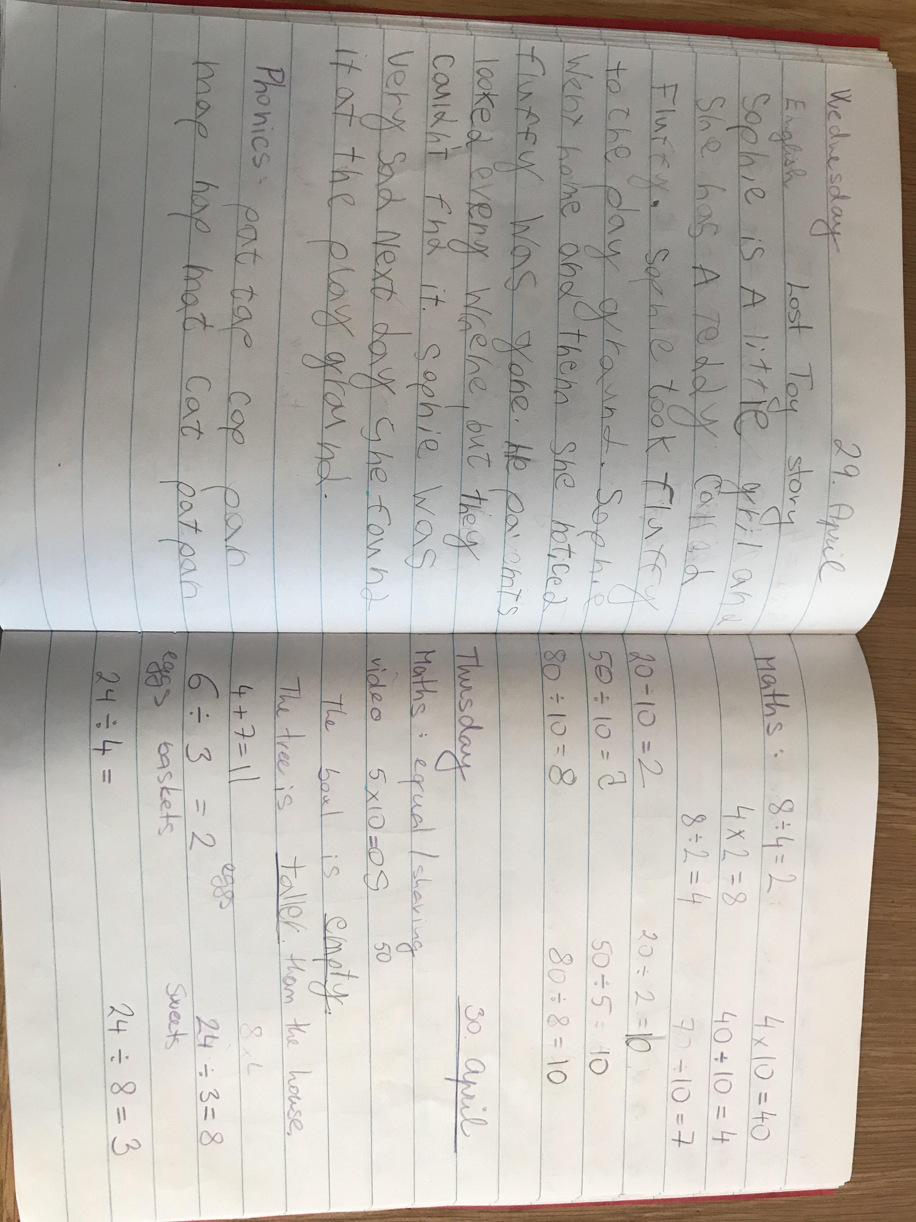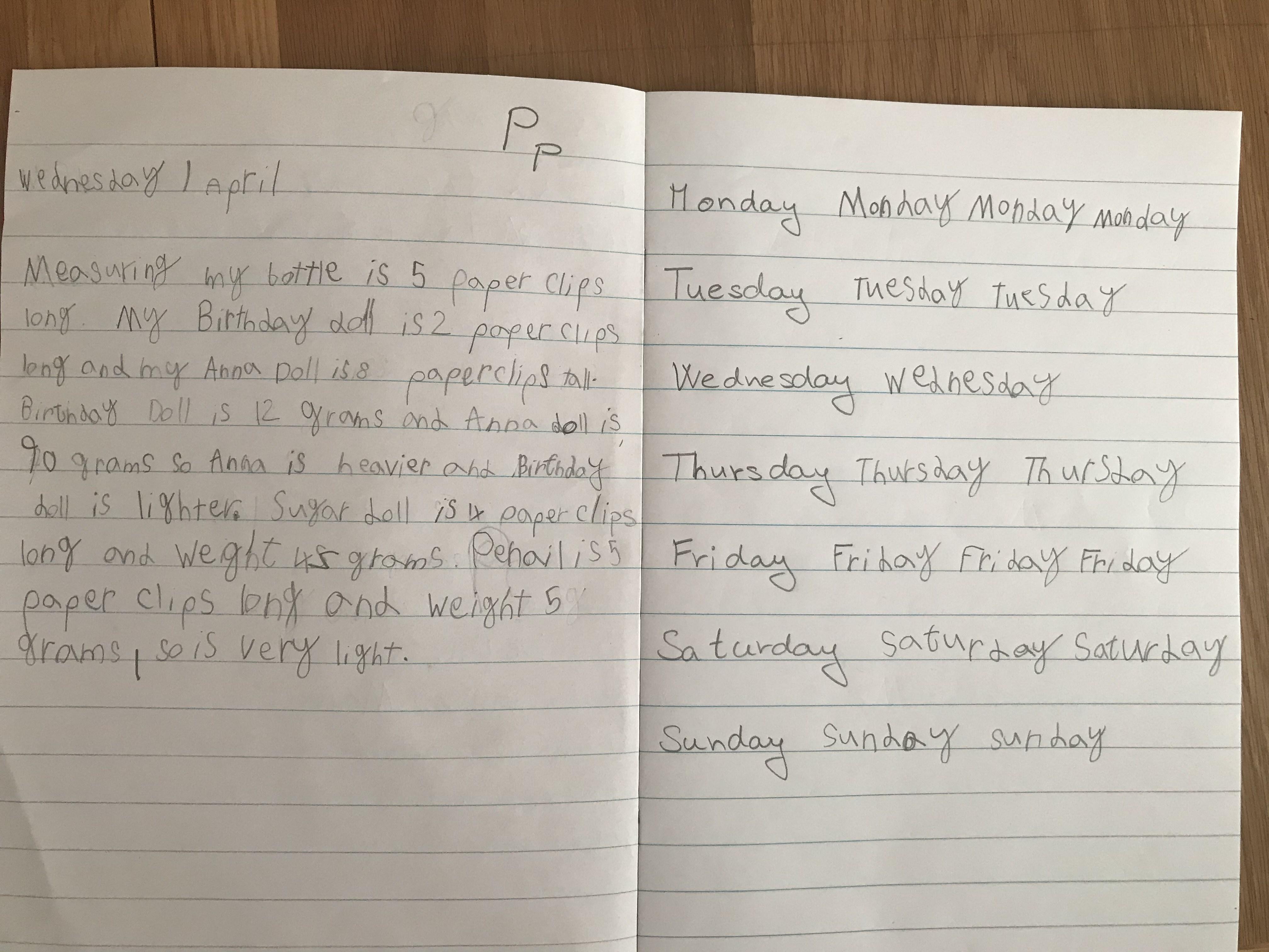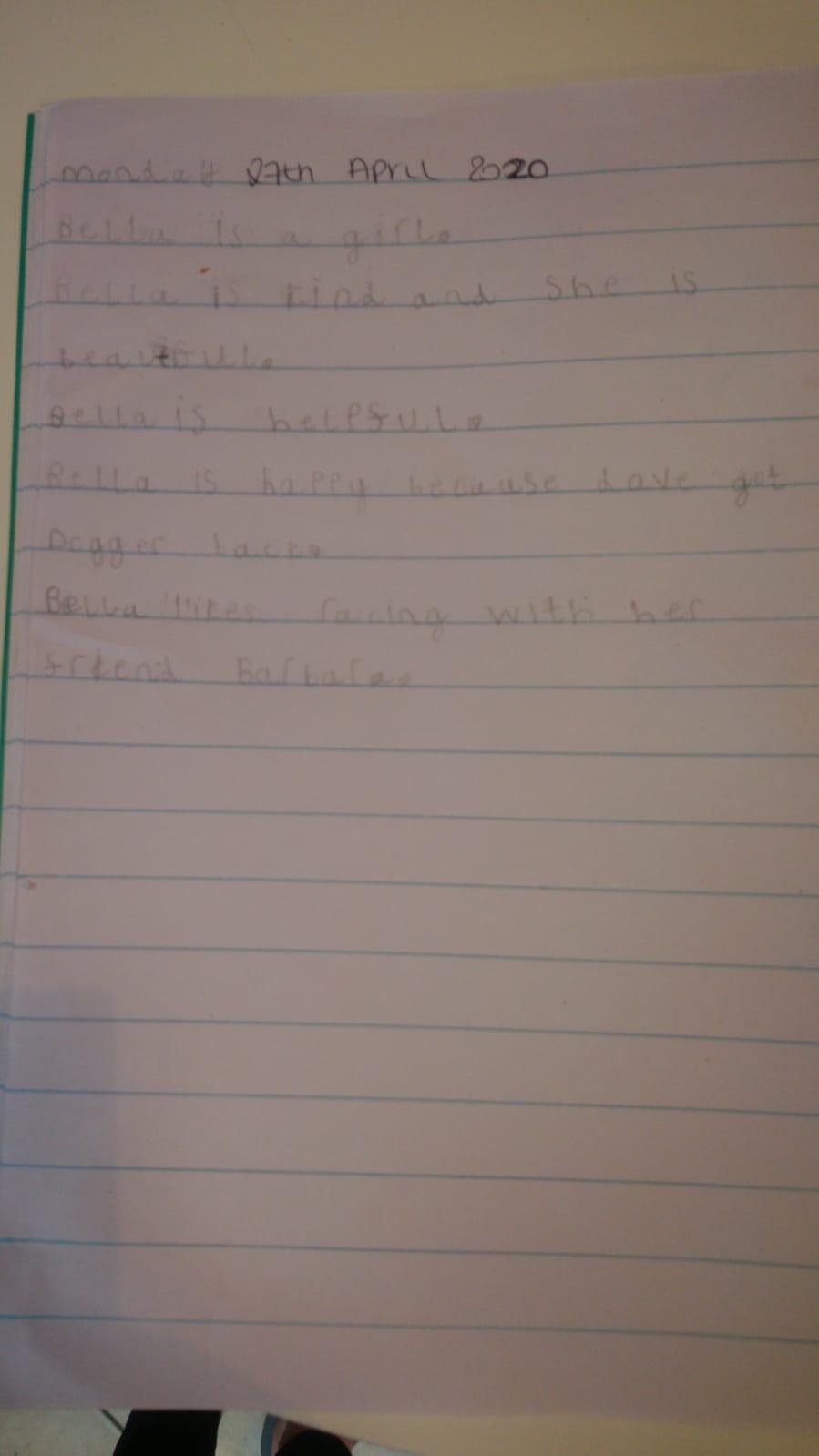 "Darcy really enjoyed her live phonics on youtube...she has been practising her writing a lot and making sure the tails are below ... Darcy wrote a description of Bella ... added to the diary of her day ... did a timeline of her life with major points and favourite toys and practised  division using pasta and circles"