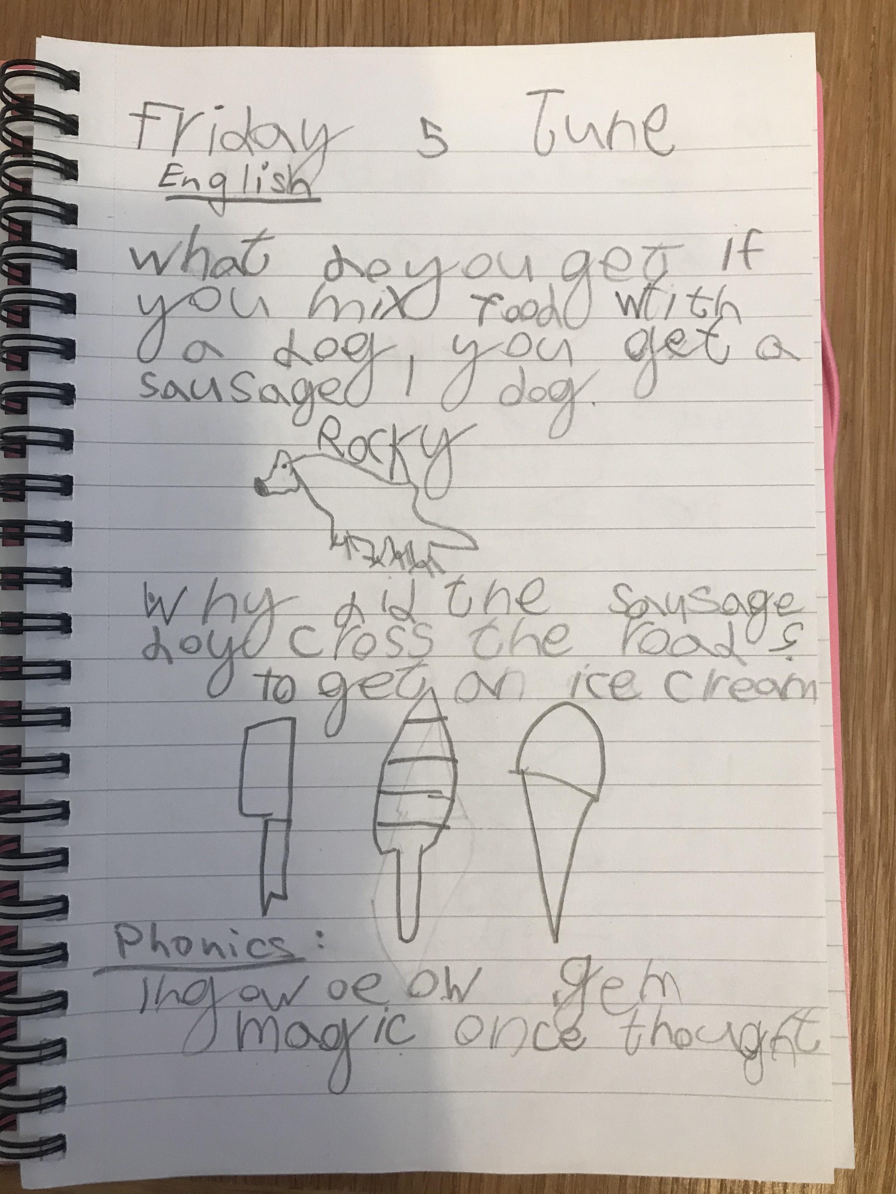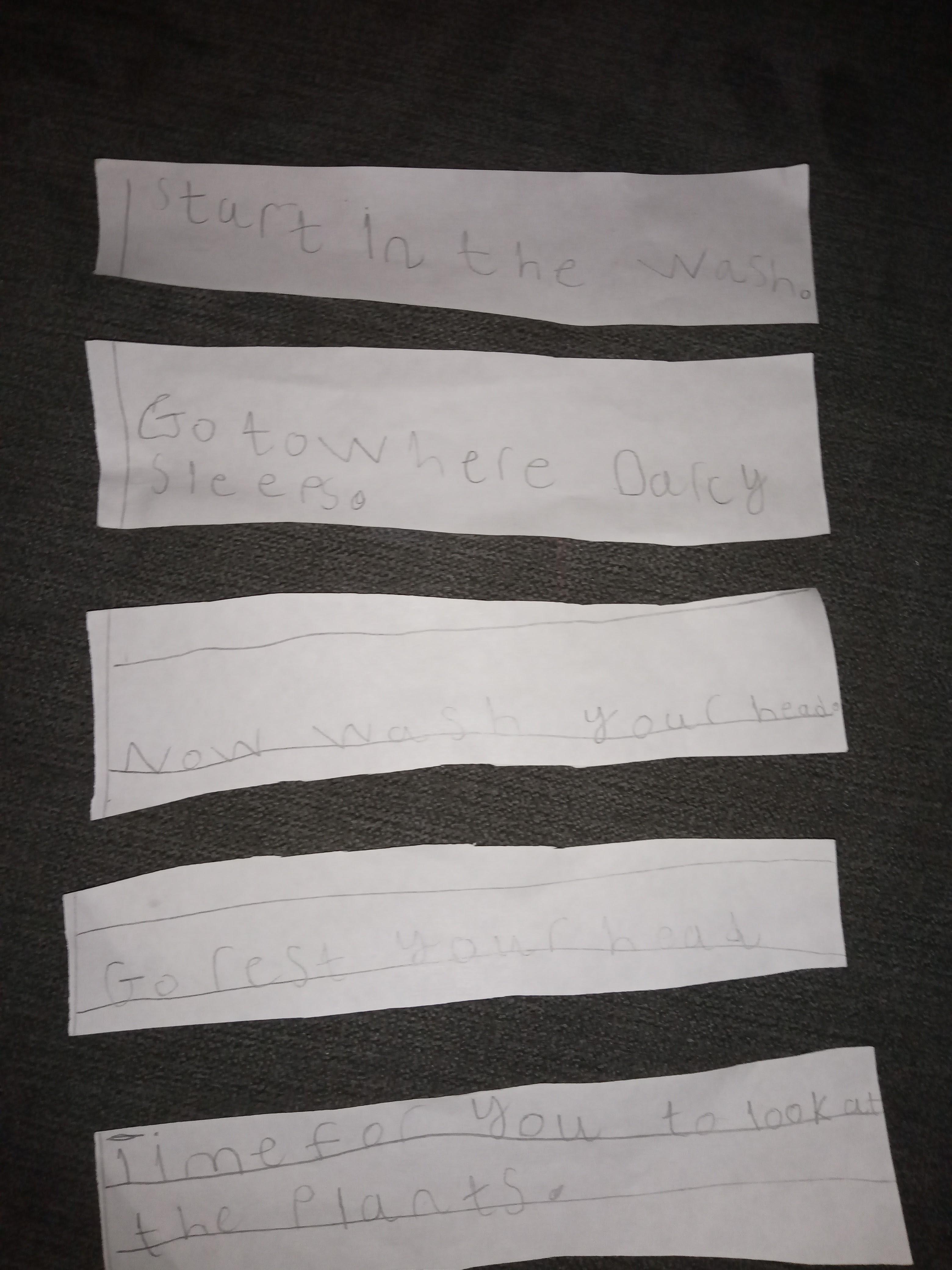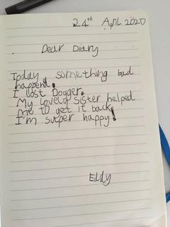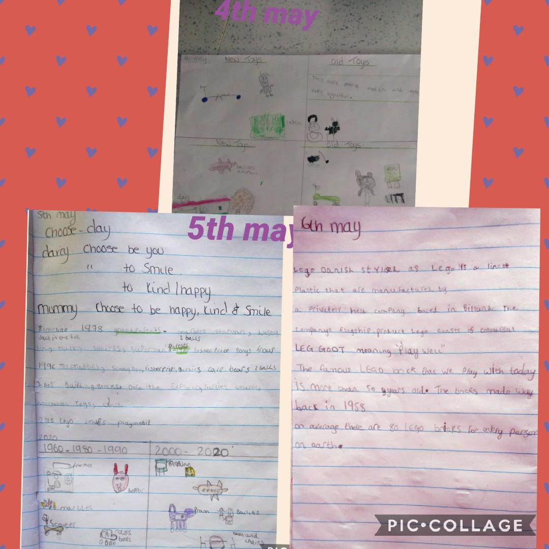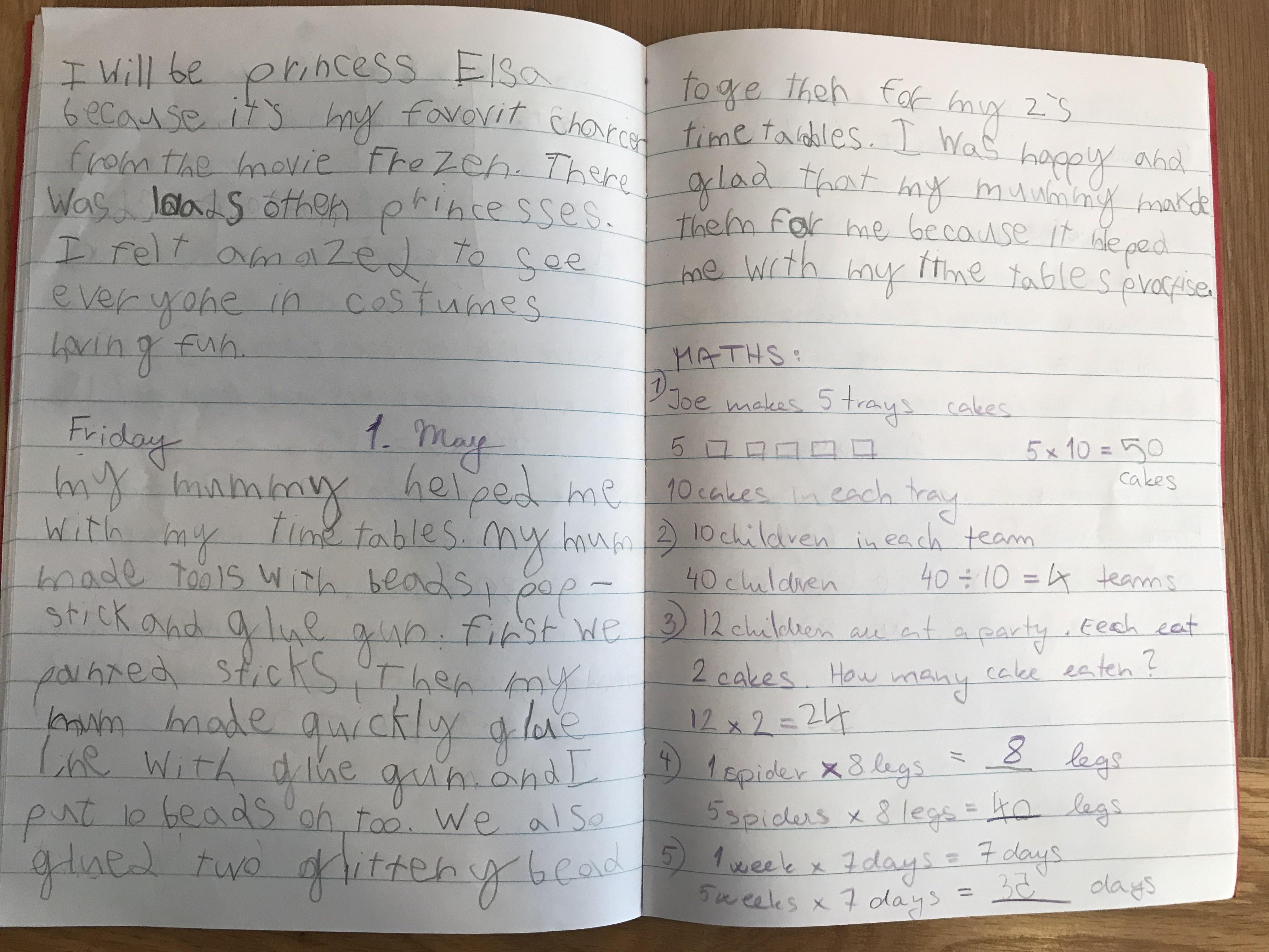 "Darcy really enjoyed her live phonics on youtube...she has been practising her writing a lot and making sure the tails are below ... Darcy wrote a description of Bella ... added to the diary of her day ... did a timeline of her life with major points and favourite toys and practised  division using pasta and circles"