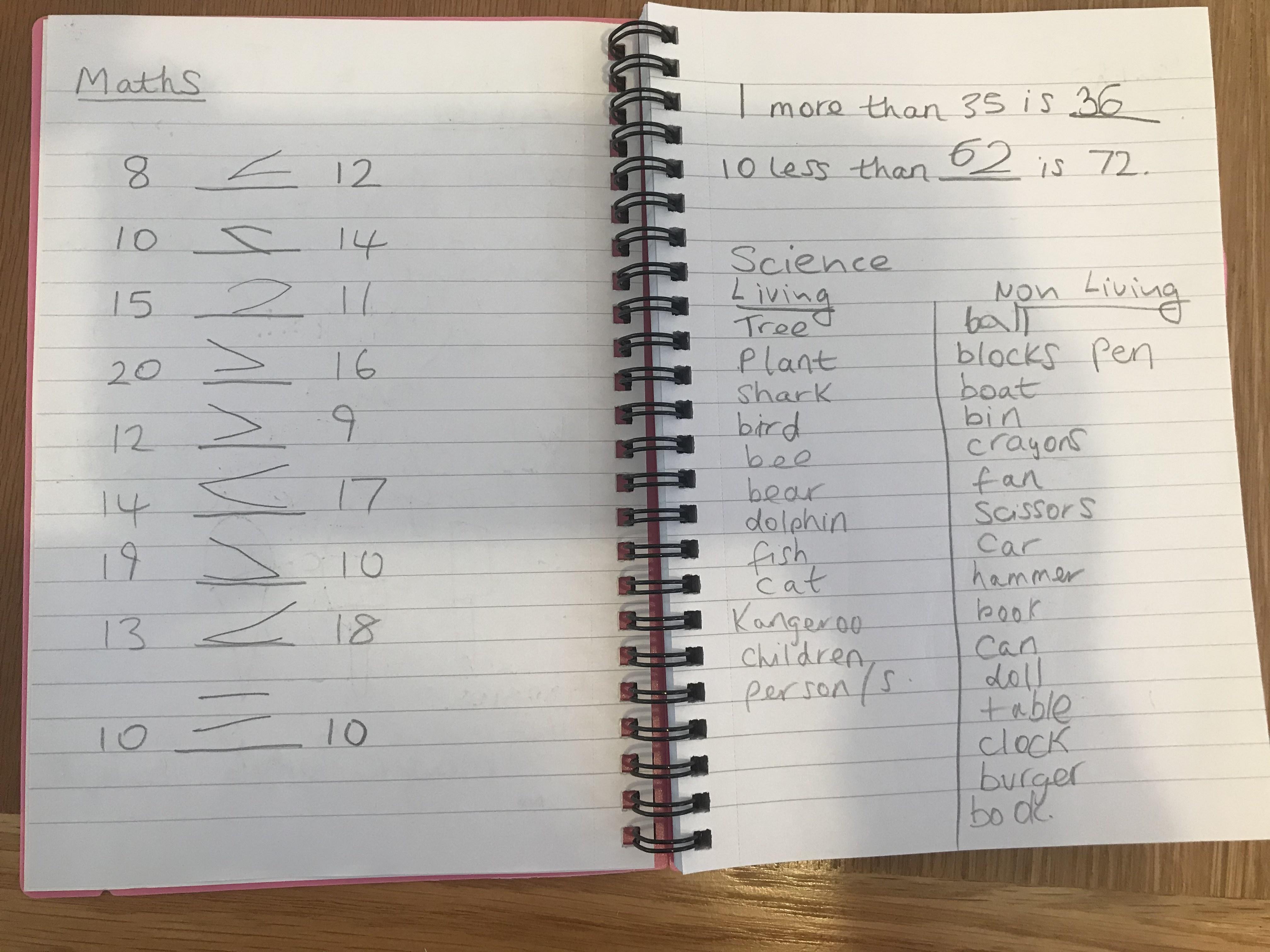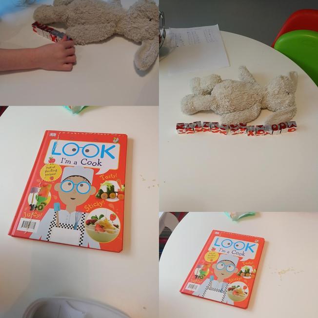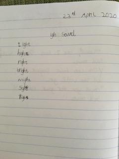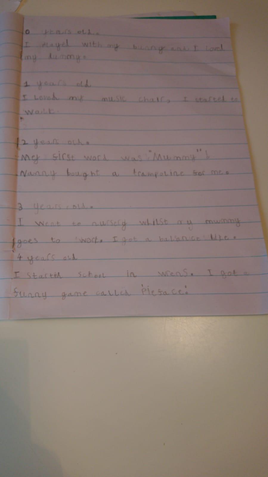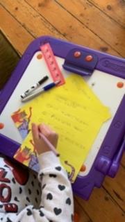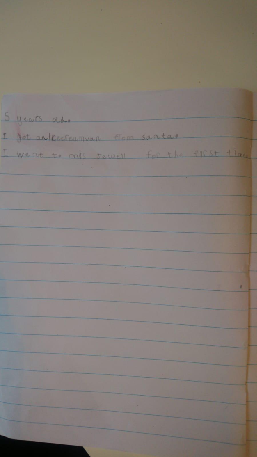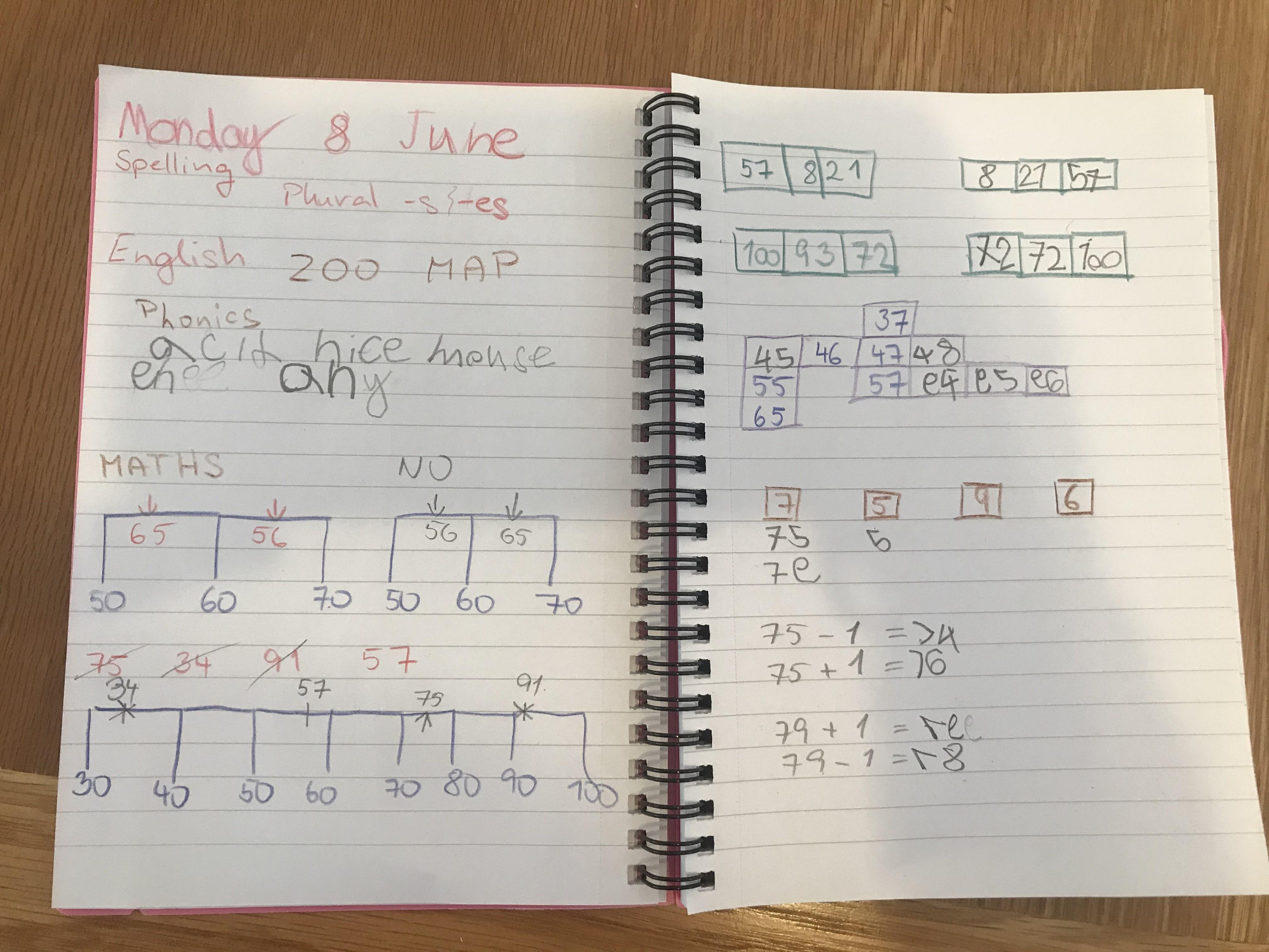 "Darcy really enjoyed her live phonics on youtube...she has been practising her writing a lot and making sure the tails are below ... Darcy wrote a description of Bella ... added to the diary of her day ... did a timeline of her life with major points and favourite toys and practised  division using pasta and circles"