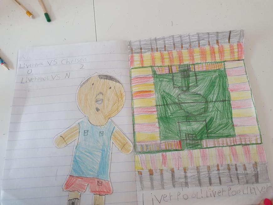 Eddy and Jude have sent in pictures they have drawn of things they are interested in. Edwards' is crazy about Astronomy and so has designed a poster about planets and Jude is a loyal fan of Liverpool football and has drawn Anfield stadium.  In my head I can hear Jude and Freddie singing 'We'll never walk alone' when I look at this picture.