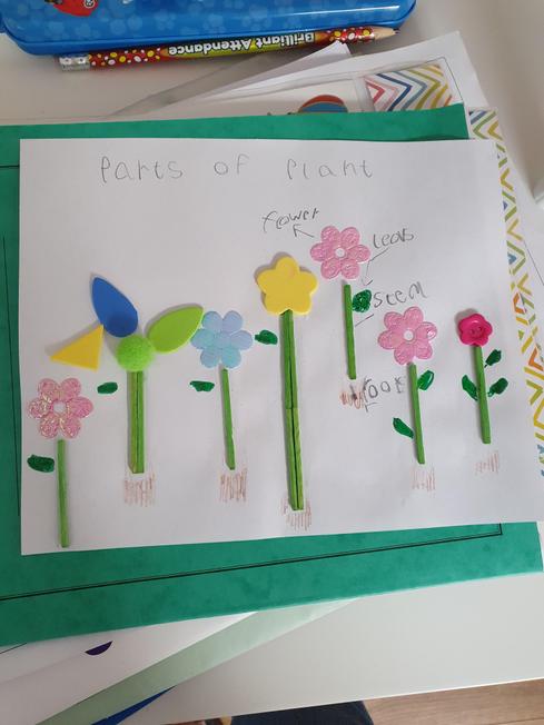 Jude C had sent in some photos of his super learning.  So far this week, in addition to his English and Maths learning, he has made a bug house, designed a poster on How Plants Grow, labelled parts of a plant and created a beautiful glitter picture.  Well done Jude.
