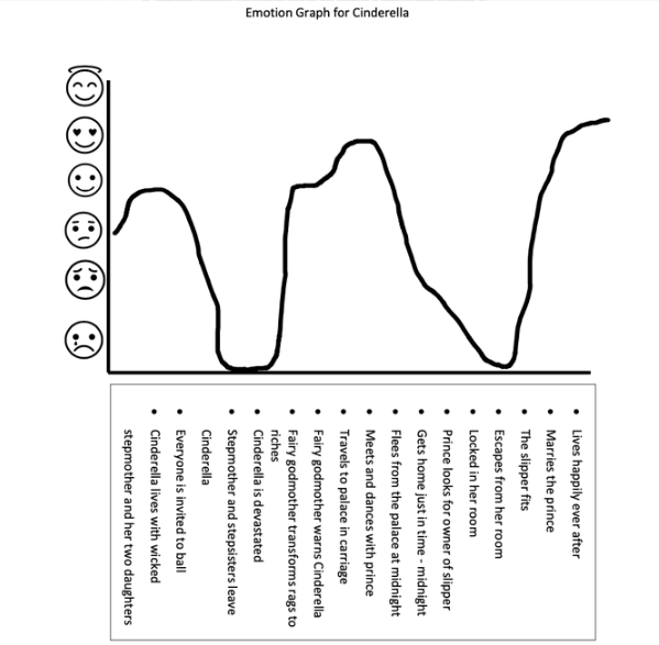 Here is an example of an emotion graph, using the story of Cinderella. This is very basic but I hope it gives you an idea of what to do - identify key points in the story and plot how the character feels. This example uses pictures to depict emotions but I wonder if you can include adjectives which will describe Jack's emotions and feelings. You could, as an extra challenge, shade the graph using colour to depict emotions. If you are stuck, scroll to the top of the page and look at what I want you to do in this lesson - this is about identifying Jack's emotions and feelings and thinking about how and why they change.
