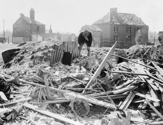 An Anderson shelter stands intact amongst a scene of debris in Norwich, c.1941