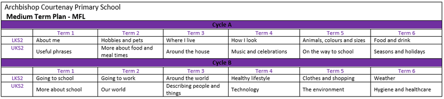 At Archbishop Courtenay, our MFL curriculum offers children the tools they need to learn Spanish, many of which are transferable to other languages. Below explains the structure, expected learning outcomes and the detail of the content covered throughout our curriculum.