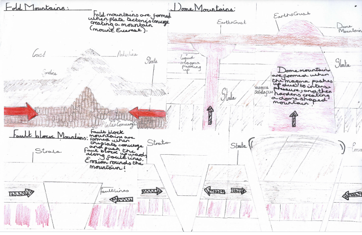 Draw and label the three different types of mountains you learned about: FOLD, BLOCK and DOME. Show using arrows how each formed. You can find and use the templates for your diagrams by clicking the image below. There's also a fact sheet and some color pictures of the diagrams to help you. Look at how this person has done it. Then click the image to go to the templates!