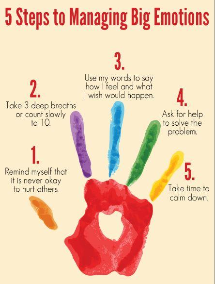 Now we would like you to think about a time when perhaps you did not make the right choice, how did it make you feel? How do you think it made others feel? Have a look at the 5 steps to managing big emotions. Maybe you could make your own, what would your 5 steps be?
