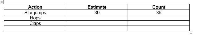 Before we start I wonder…how do we know what the time is? Now think about when we are in school, if we need to wait to have a turn on the bikes what can we use to let us know it is our turn? Today’s activity is an active one!! You are going to see how many actions you can do in one minute. You may like to try; star jumps, hops, claps, runs around the garden. First make a prediction then try it out remember to count as you go. You may like to record this in a table like this one: