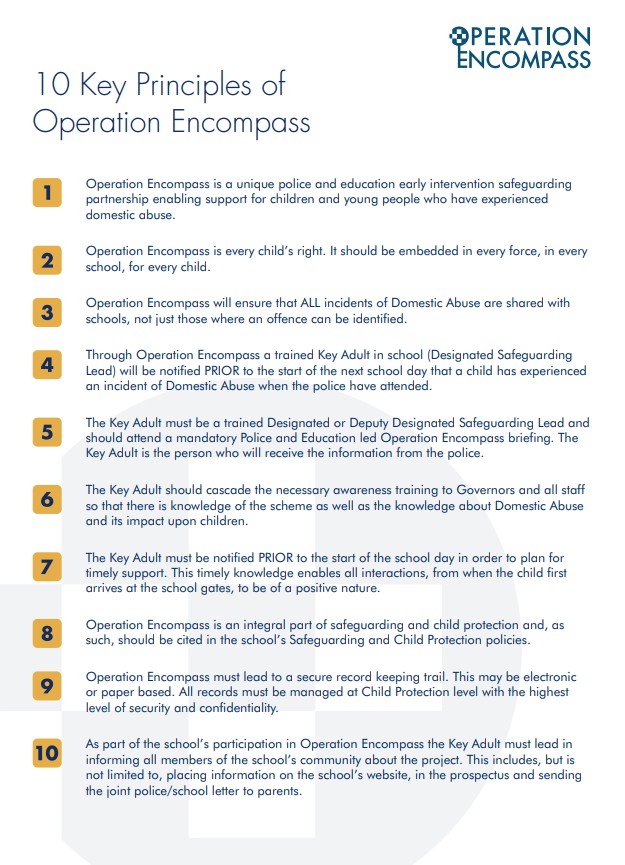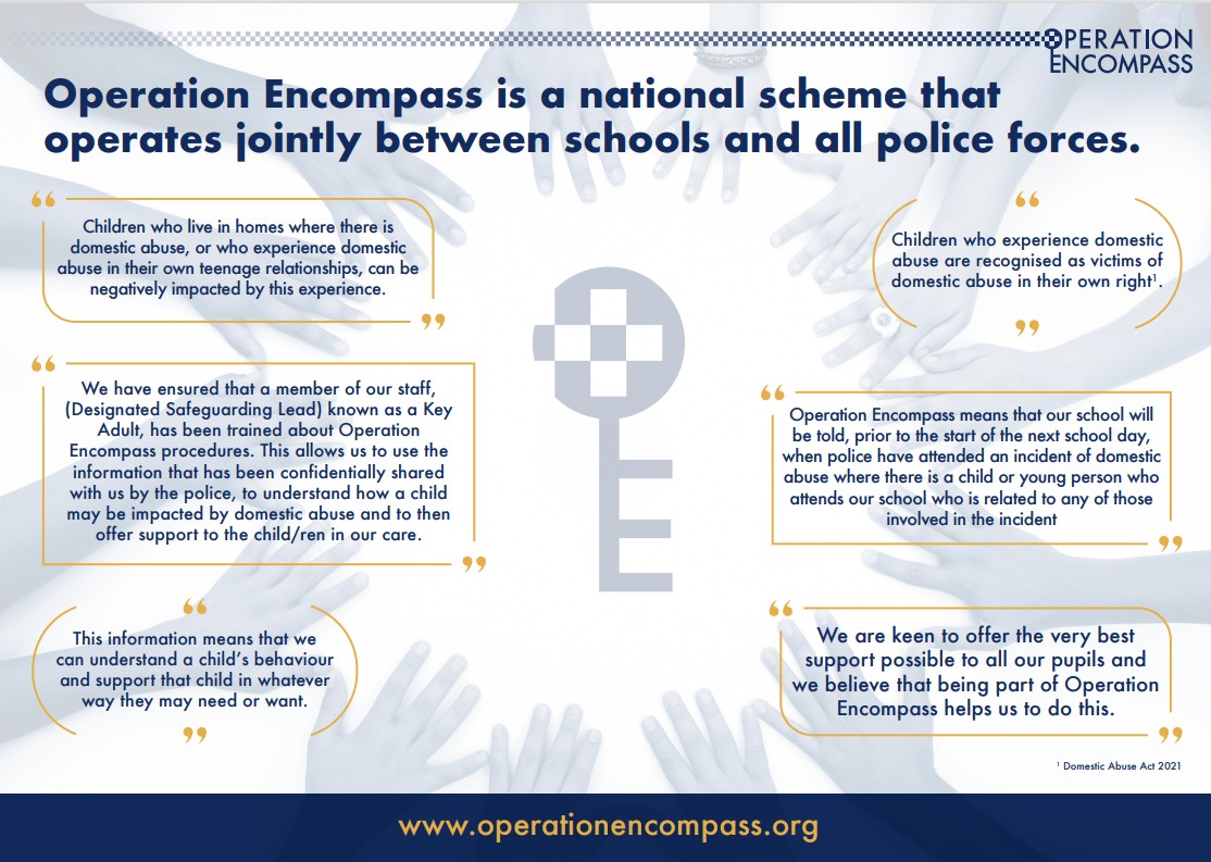 Our school is part of Operation Encompass, a national initiative that supports children who may be affected by domestic abuse. Through Operation Encompass, schools receive confidential information from the police, when appropriate, following a domestic abuse incident, enabling staff to offer timely, sensitive support to children in school. This helps us ensure that pupils feel safe, understood and supported, allowing their wellbeing and learning to remain a priority.