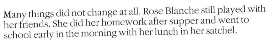 2. Describe how Rose Blanche has changed in this picture compared to the others pictures of her from pages 1 – 18.