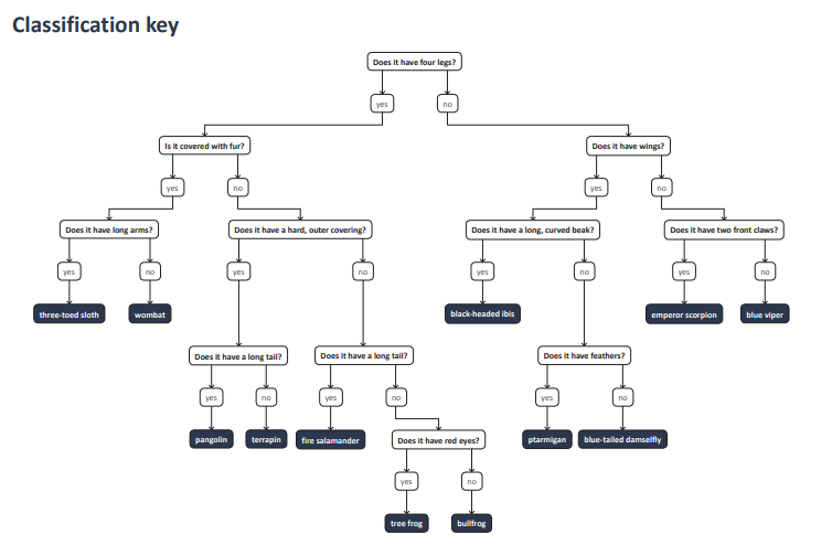 Each question should be a yes or no answer and your first question should be quite general because it needs to help sort the living things you are classifying.