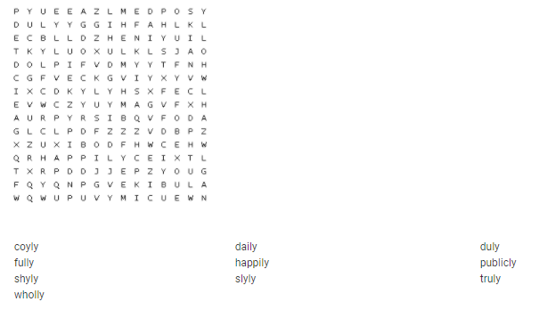 truly, duly, publicly, daily, slyly, shyly, fully, wholly, coyly, happily