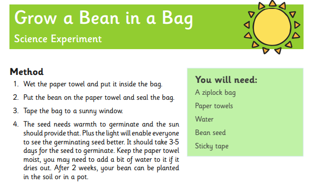 Today we are learning about how seeds germinate. You should have a some beans that were sent to you in the post. You may also choose to plant other seeds. Follow the instructions in the packet to help your bean germinate.