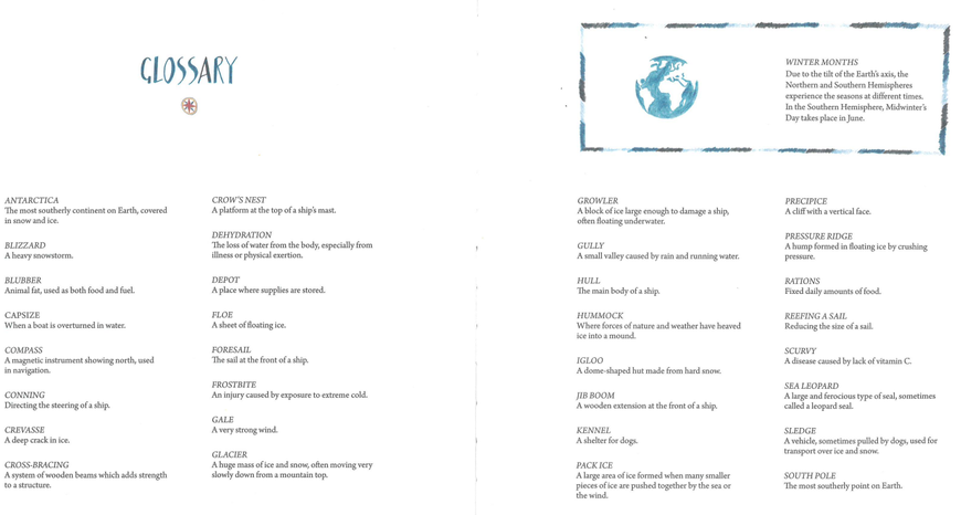 Read carefully the following double page spread from Shackleton’s journey and any words in bold you are unsure of check out the glossary in the second image. You’ll need to create a pamphlet/sales leaflet this week to give to Shackleton to convince him to buy your boat! You’ll have two days to complete this! You’ll need to use a mixture of facts from the image below and your own opinion. E.g. “The bow is 1.3metres thick which is especially strong (fact) and will surely smash through any ice that gets in its way (opinion because it isn’t proven yet).