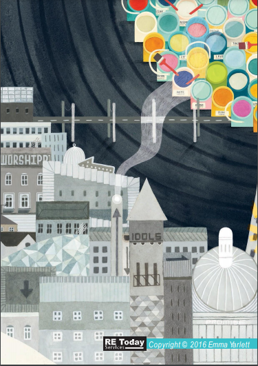 Why is there a cross connecting the paint pots to the grey city? Why is there a swirl of white mist/smoke going through the cross to the paint pots? Some of the words on the paint pots are LOVE, PEACE, HOPE, FREEDOM. What do they mean? How might they be connected to the white cross?What do the words WORSHIP IDOLS mean in the frieze? Would you like to live in this city? Why/Why not?