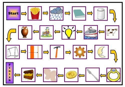 You could either use this board game or make one of your own. Draw some pictures, roll the dice, move that many spaces, then when you land on a picture: