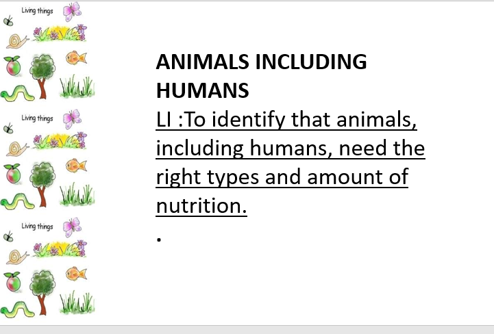 L.I: IDENTIFY THAT ANIMALS AND HUMANS NEED THE RIGHT TYPES AND AMOUNTS OF NUTRITION