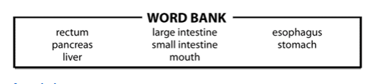 COPY THE DIAGRAM AND USE THE WORDS IN THE WORD BANK TO LABEL THE PARTS OF THE DIGESTIVE SYSTEM CORRECTLY.